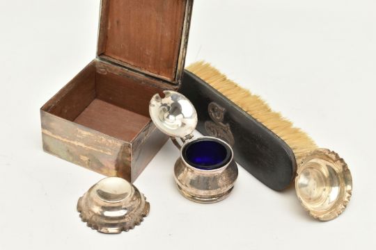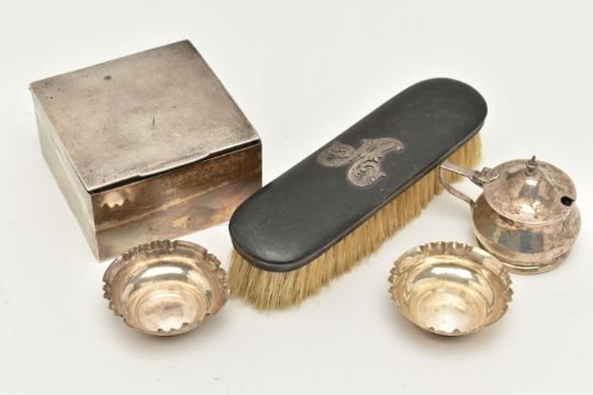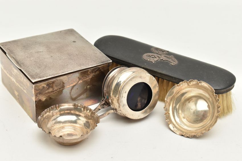 AN ASSORTMENT OF SILVER, to include a silver square form cigarette case, hallmarked 'Charles Edwards' London 1903, two small dishes, hallmarked 'Charles Boyton' London 1890, a silver mustard with blue glass insert, hallmark rubbed, together with an ebonised wooden brush with a white metal initial, approximate gross weight of weighable silver 56.9 grams, 1.83 ozt, (condition report: general moderate wear, overall condition good)