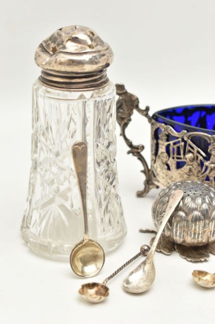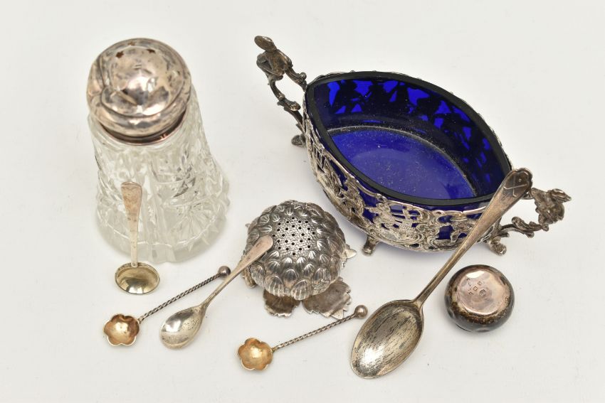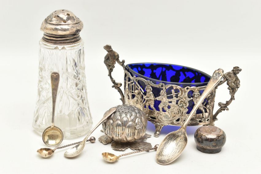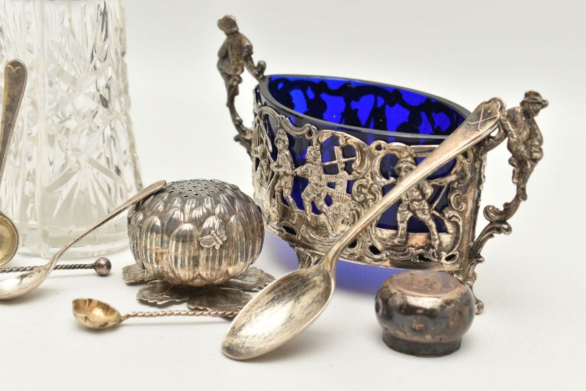 AN ASSORTMENT OF SILVER AND WHITE METAL, to include four silver salt spoons, a silver teaspoon, a silver lidded glass jar, two silver lids, all with British hallmarks, approximate gross weight 40.1 grams, 1.29 ozt, together with an oriental pepperette and a continental condiment dish with blue glass insert, condiment dish stamped 800, approximate gross weight 113.8 grams, 3.66 ozt (condition report: general moderate wear, silver lid is indented, pepperette has come apart from base, overall condition good)