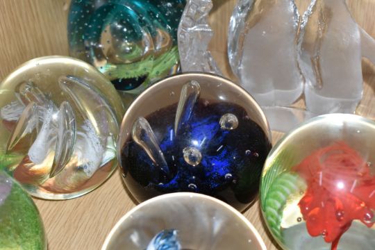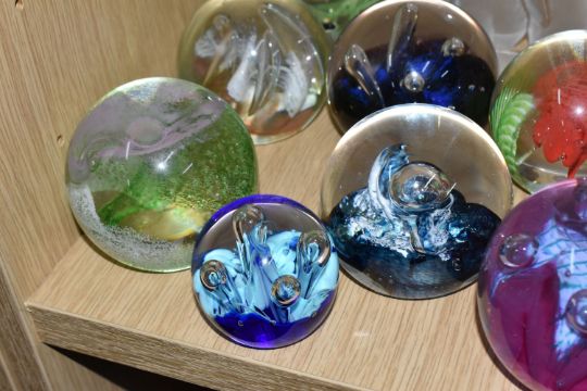 A GROUP OF CAITHNESS GLASS AND OTHER PAPERWEIGHTS, to include Caithness limited editions 'Star Orchid' numbered 141/150, 'Alpine Winter' 488/650 (knock to one side, and 'Amber Gambler' 197/750, with 'Miniature Mayflower' and 'Millennium Miniature' (af, has flaws running through the paperweight), with six Caithness CIIG paperweights, a Mats Jonasson sculpture of two penguins, and a variety of unmarked paperweights (qty) (Condition Report: most appear in good condition, sd and as stated in the description)
