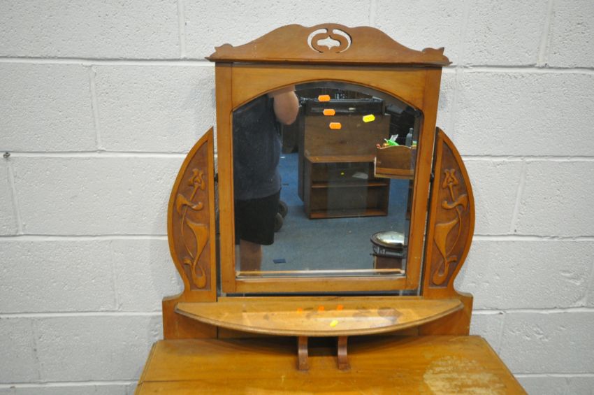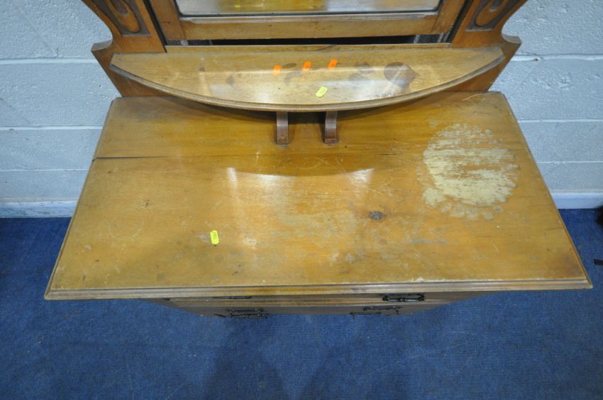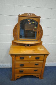 A 20TH CENTURY SATINWOOD DRESSING CHEST, with a single bevelled edge mirror, atop a base with three drawers, width 92cm x depth 48cm x height 160cm (condition report: marks, scuffs, stains, splits, one handle loose one missing, other wear and usage)