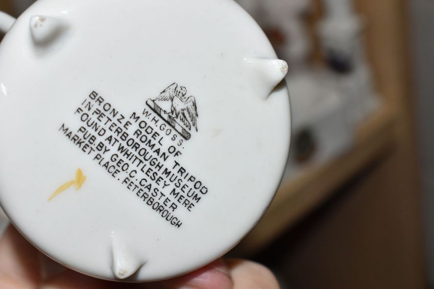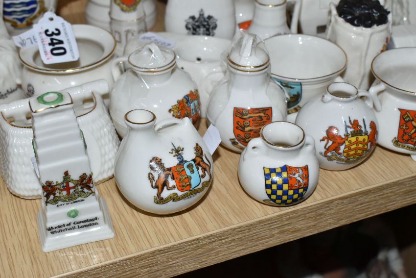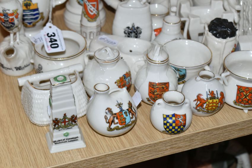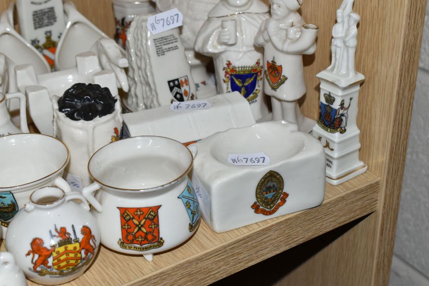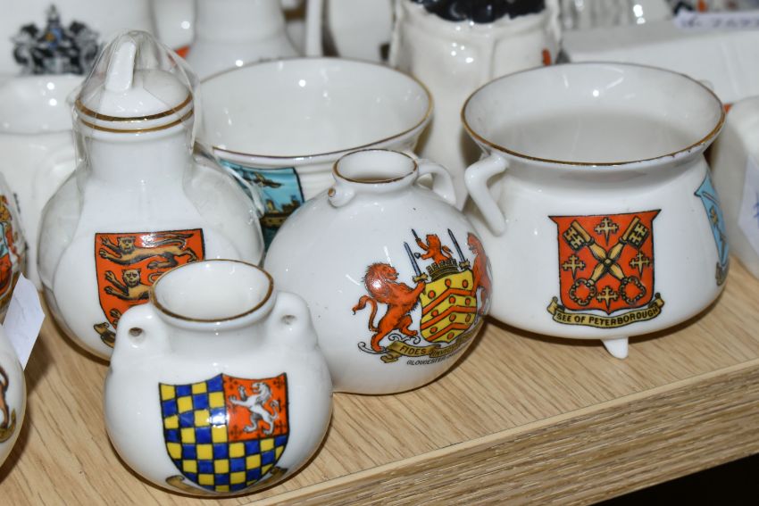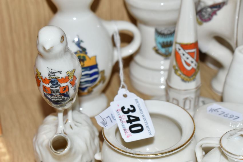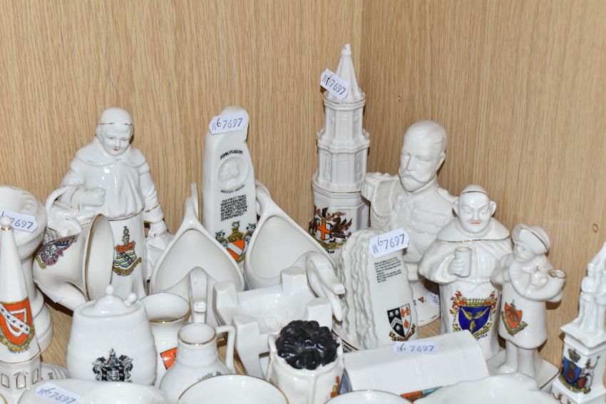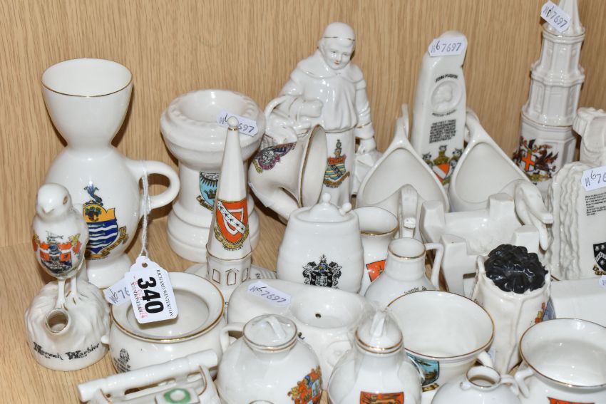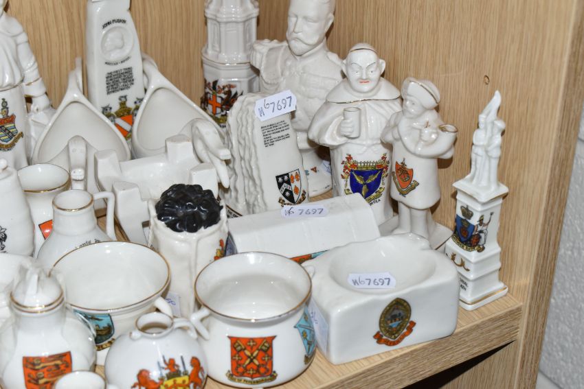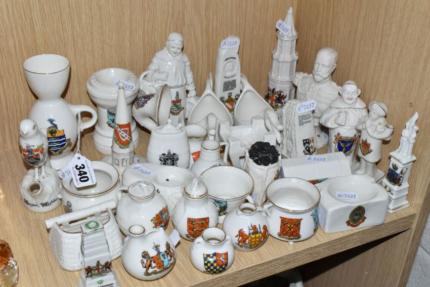 A COLLECTION OF CRESTED WARE, approximately thirty pieces including many pieces by WH Goss, shapes include a bird whistle, a bust of King George V, monks, the Rock of Ages, Norwegian dragon-shaped beer bowls, a sack of coal, a fisherman's creel and a gramophone horn (qty) (Condition Report: generally good condition, a war memorial has a repair, some wear to gilding)