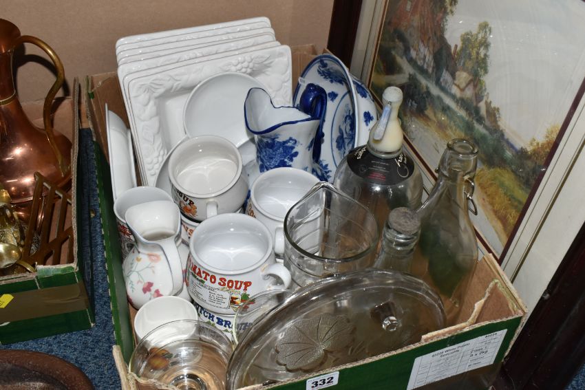 TWO BOXES AND LOOSE METALWARE AND CERAMICS, to include a copper kettle and jug, brass ornaments, cast metal bird feeders, a framed print, vintage glass soda syphon, soup bowls, etc. (s.d) (2 boxes + loose)