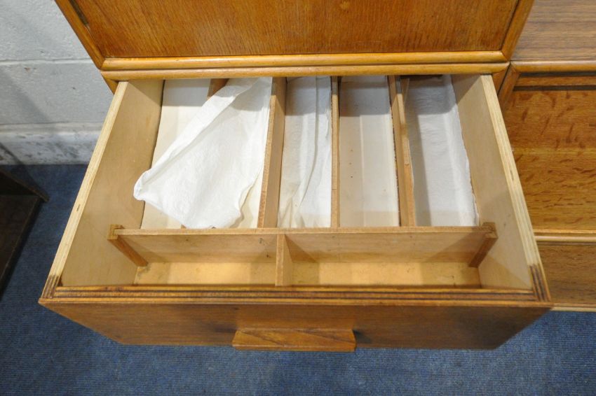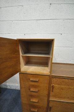 A LATE 20TH CENTURY CABINET, fitted with a cupboard door, four drawers, and two sets of double sliding doors, width 115cm x depth 39cm x height 117cm (condition report: general signs of wear and usage)
