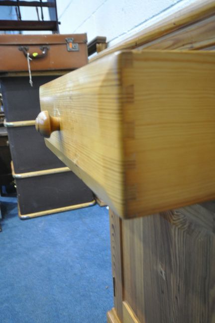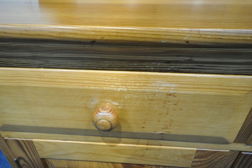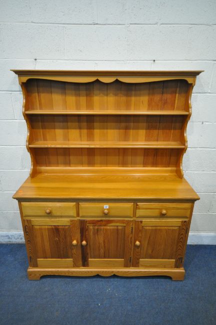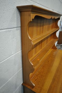 A MODERN PINE DRESSER, the two tier plate rack, atop a base with three drawers, above three cupboard doors, width 135cm x depth 47cm x height 167cm x height of base 74cm (condition report: marks, scuffs, stains, other wear and usage)