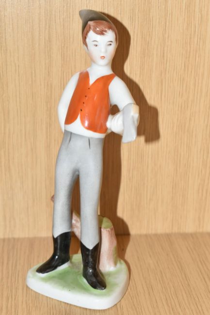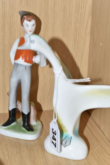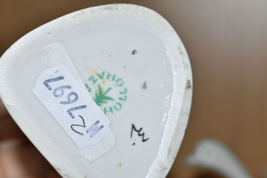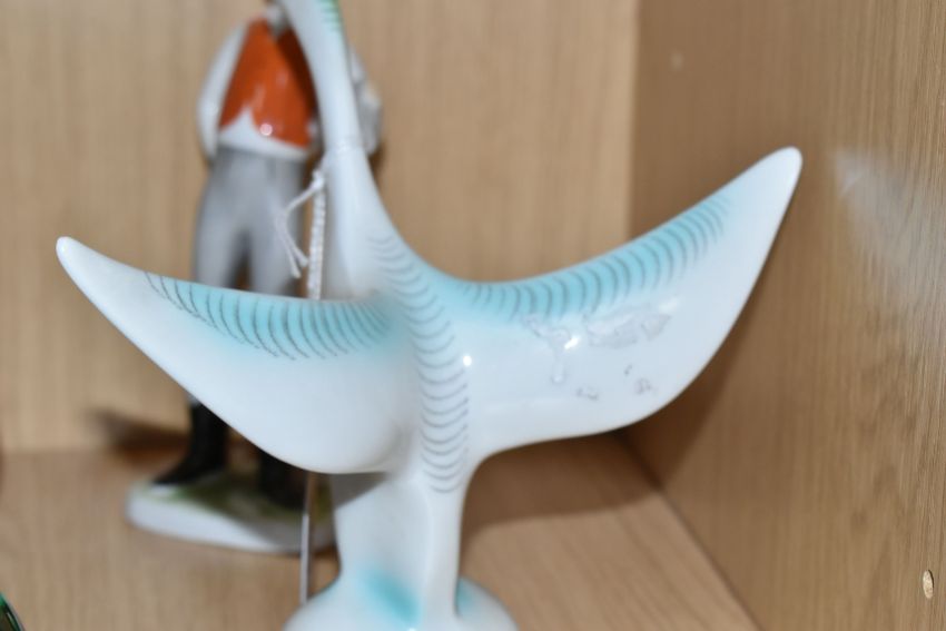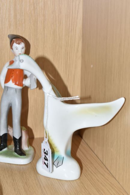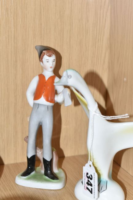 TWO HOLLOHAZA PORCELAIN FIGURES, the Hungarian figures of a young man with an axe and a goose with outstretched wings, green printed backstamps, height of tallest 15cm (2) (Condition Report: figures appear in good condition, no obvious damage)