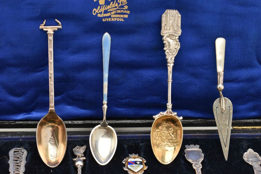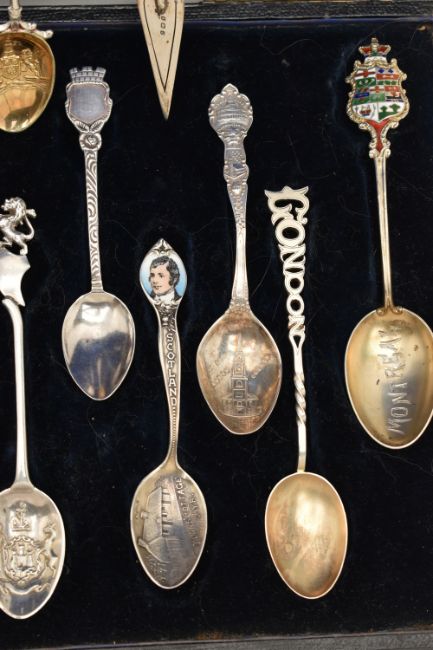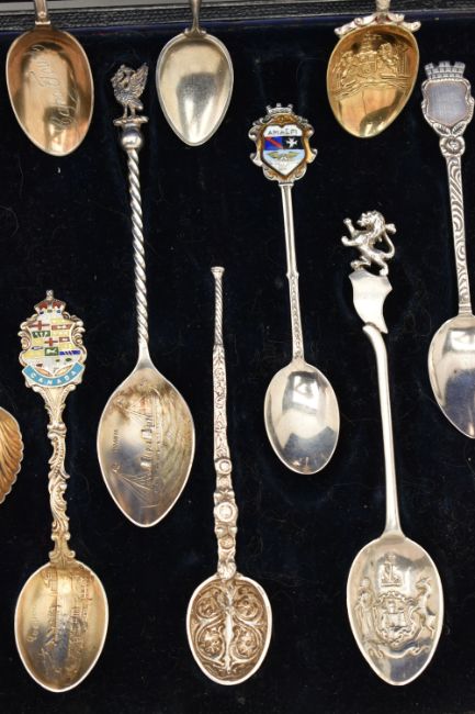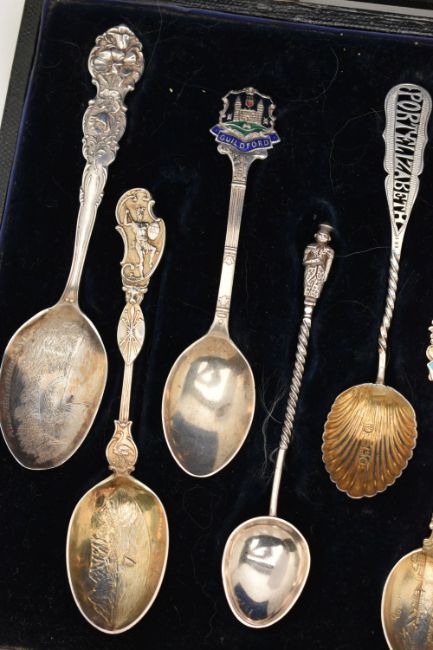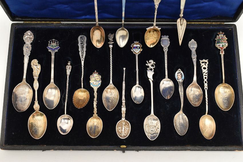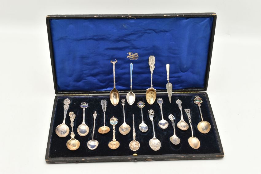 A SELECTION OF EIGHTEEN SOUVENIR TEASPOONS AND A SILVER BOOKMARK, to include a blue enamel Marius Hammer spoon, an Edwardian mother of pearl handle and silver bookmark, further spoons, many early 20th century examples, many with silver hallmarks, some with enamel terminals, in a hinged case, approximate total weight 227.5 grams, 7.3 ozt