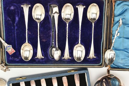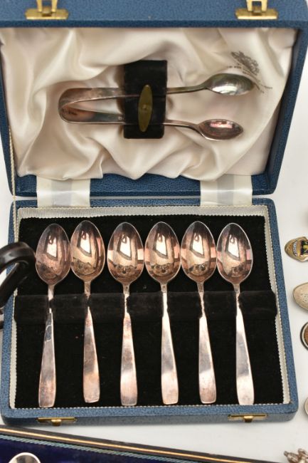 A SELECTION OF SILVER PLATED WARE, to include a cased set of six Mappin & Webb teaspoons and a pair of sugar tongs, a further cased set of five Walker & Hall teaspoons and sugar tongs, together with two milk jugs, and eight souvenir teaspoons