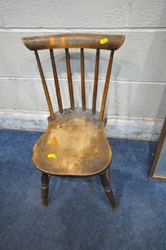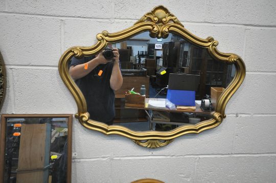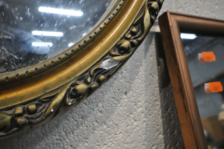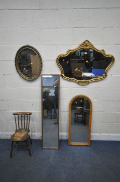 A GILT FRAME WALL MIRROR, 91cm x 69cm, an oval gilt mirror, two other mirrors, along with a child's chair (condition report: oval mirror with chips, chair with marks, scuffs, stains, all with signs of usage) (5)