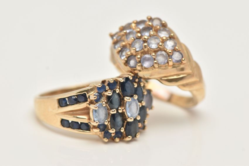 TWO 9CT GOLD GEM SET RINGS, the first of a marquise cluster form, set with circular cut pale purple stones assessed as iolite, stepped shoulders leading onto a polished band, hallmarked 9ct Birmingham, ring size M 1/2, the second a cluster ring set with oval and circular cut blue sapphires with set shoulders leading onto a polished band, hallmarked 9ct Birmingham, ring size O 1/2, approximate gross weight 10.1 grams (condition report: general light wear, would benefit from a gentle clean and polish, overall condition good)