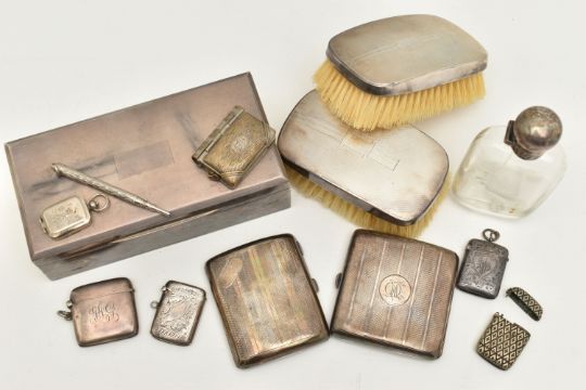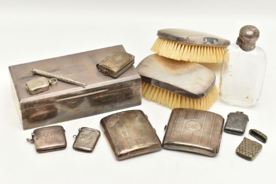 A COLLECTION OF SILVERWEAR AND WHITE METAL ITEMS, to include a wooden cigar box with outer silver engine turn detail, hallmarked silver 1950?, two cigar cases one hallmarked Chester 1921 makers mark D Bros, one hallmarked Birmingham 1923 sponsors mark CTB, three silver Vesta cases, a glass jar with silver top, two silver mounted brushes, a retractable pencil, base metal vesta case (AF), a base metal hinged vanity case and a base metal novelty coin holder designed as a book, approximate gross weight of two silver cigar cases and silver three vesta cases 265 grams (condition report: