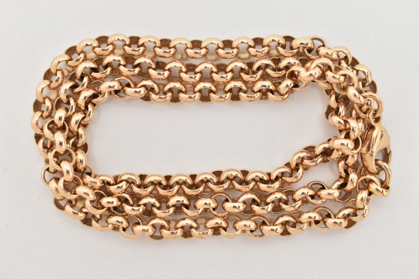 A 9CT GOLD CHAIN NECKLACE, a yellow gold belcher link style chain, fitted with a lobster clasp, approximate length 520mm, hallmarked 9ct Birmingham Sheffield, approximate gross weight 29.5 grams, (condition report: general moderate wear, overall condition good)