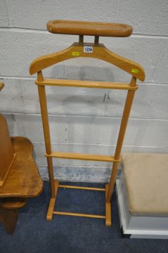 A BEECH VALET STAND, with a cuff link tray, height 115cm, a white painted storage stool, a live edge style bench, along with a magazine table (condition report: general signs of wear and usage to all) (4)