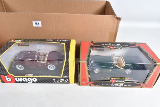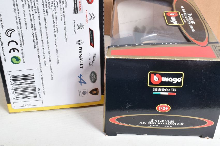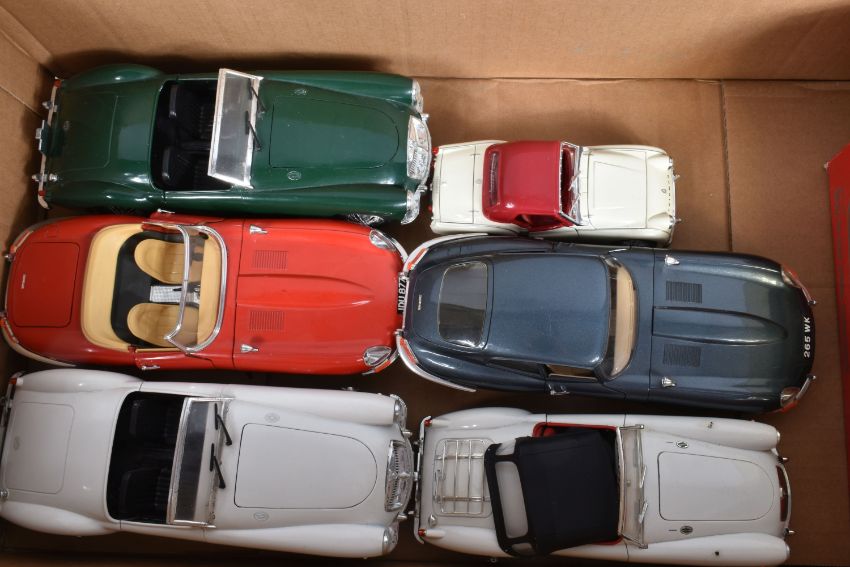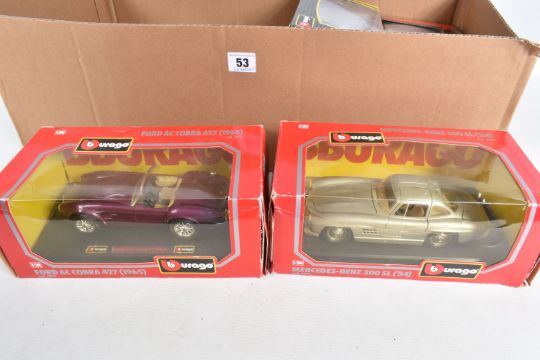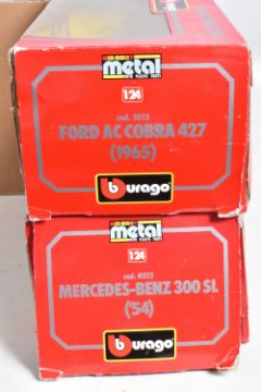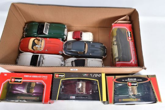 A TRAY CONTAINING A SELECTION OF BOXED AND UNBOXED BBURAGO MODEL VEHICLES, boxed models include a Mercedes-Benz 300 SL ('54) numbered 0522, a Jaguar XK 120 Roadster (1948) numbered 1502, a Ford Accobra 427 (1965) numbered 0513 and a Jaguar XK 120 Roadster (1951), unboxed models include a Polistil model numbered 01111 MGA Twin Cam, a Jaguar 'E' (1961), a Revell MGA, a Saico DP6001-2, a Jaguar 'E' (1961) in red and a Polistill MGA Twin Cam in Green, all models are in varying conditions some very good to some with loose pieces, boxes of boxed mostly have some damages in the form of scuffs, scratches and bends, some loose or torn panels, not checked for completion