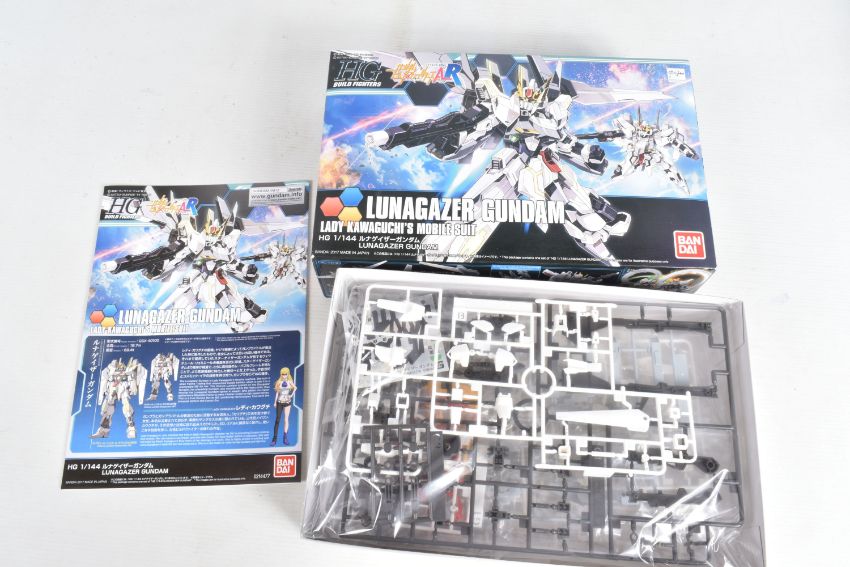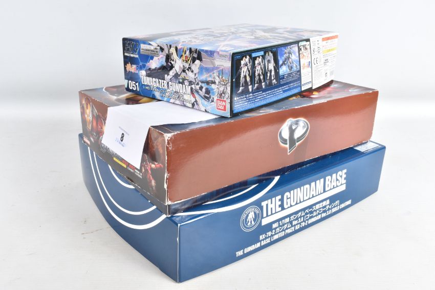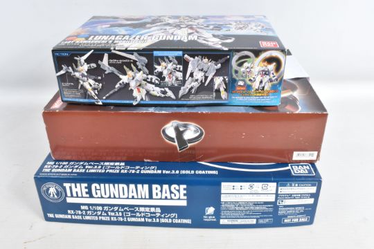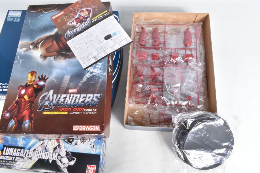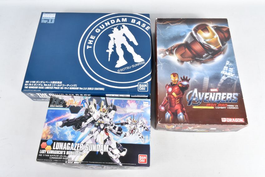 THREE BOXED UNBUILT MODEL SCALE ACTION FIGHTER FIGURE KITS, to include a HG Ban Dai Lunagazer Gundam 'Lady Kawaguchi's Mobile Suit', 1:44 scale, kit no. 0214477, a Marvel Avengers Iron Man Mark VII Combat Version, 1:9 scale, kit no. 38321, and a MG Gundam Base Limited Prize Gundam Version 3.0 with gold coating, kit no. RX-78-2, the kits are in like new condition, all include instructions and pieces are in factory sealed bags, the outer cardboard boxes are in good condition showing only slight storage wear, contents have not been checked for completeness
