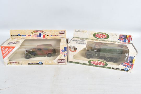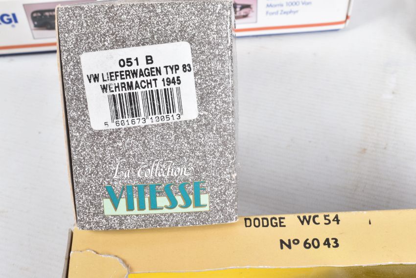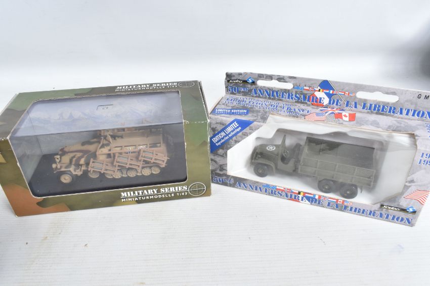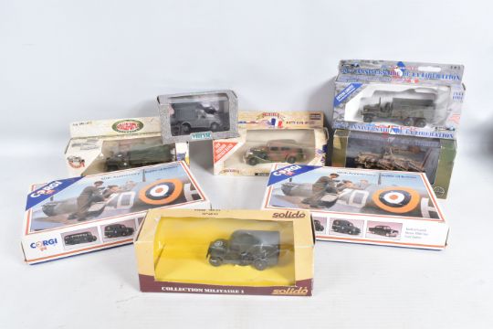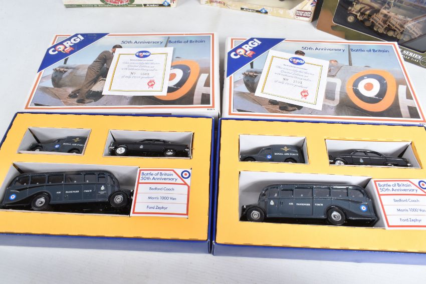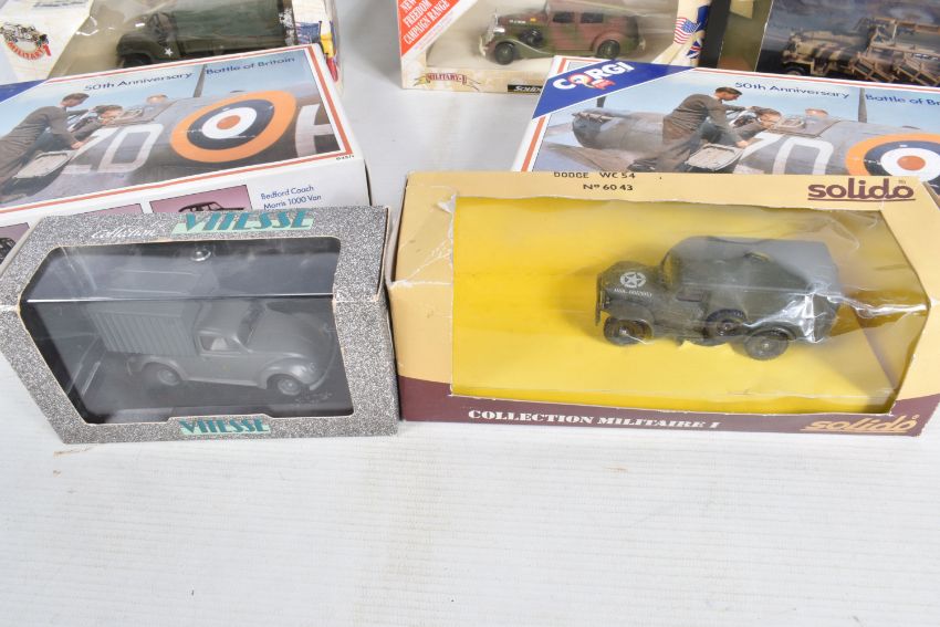 EIGHT BOXED DIECAST MILITARY VEHICLES, to include two Corgi 50th Anniversary Battle of Britain Bedford Coach Morris 1000 Van Ford Zephyr, each with Authenticity Certificates, model numbers D35/1, a Vitesse VW Lieferwagen Type 83 Wehrmacht 1945, model no. O51 B, a Schuco Scale 1/43, SDKFZ 251 Stuka ZU FUSS Germany 1942 Military Sand, model no. 324-6387, and four Solido Military vehicles, a Dodge WC 54, model no. 6043, a 7811 Packard Model Limited Edition, a Limited Edition 50th Anniversary De La Liberation, model number 4494 23, and a Les Grandes Batailles/The Famous Battles, GMC Lot 7, model number 6118, all models appear in good condition, outer cardboard boxes in good condition showing only slight wear, contents have not been checked for completeness