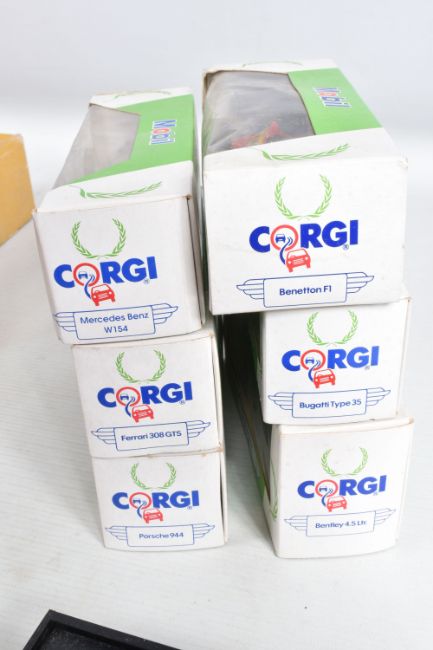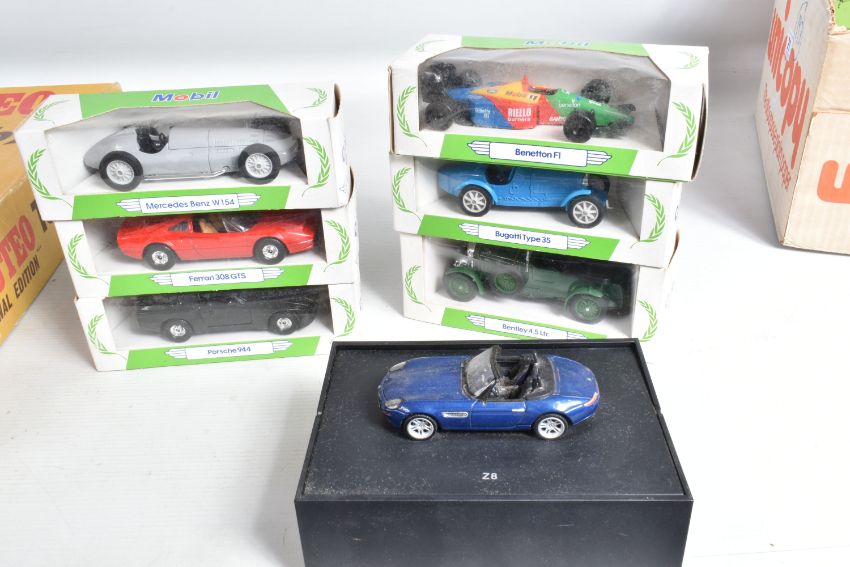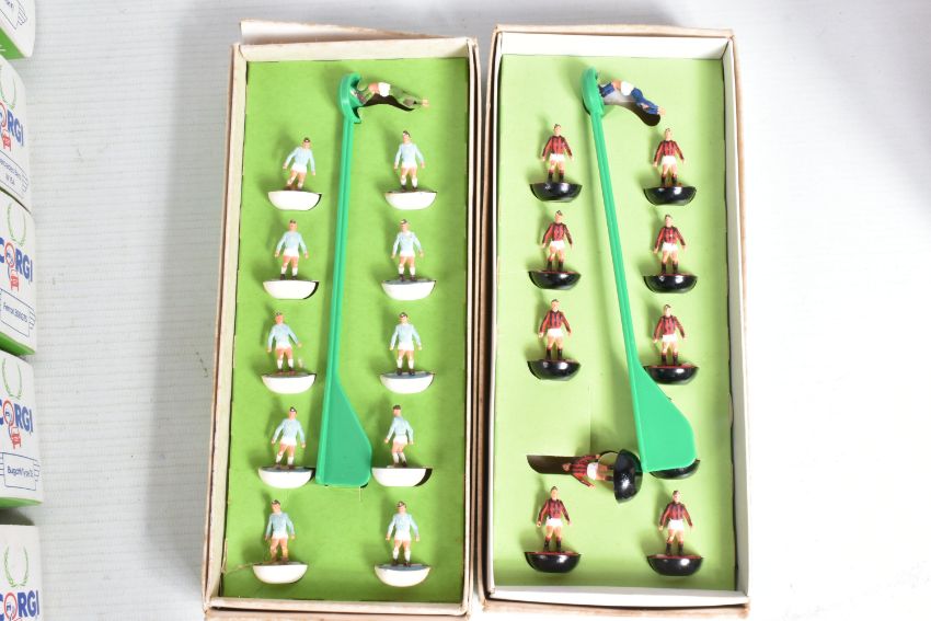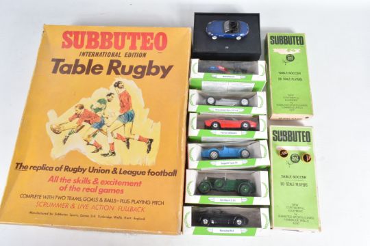 A BOXED SUBBUTEO TABLE RUGBY INTERNATIONAL EDITION SET, appears complete and in very good condition except missing the ball, the two teams are Bradford Northern and Castleford (R9 & R11), box complete but has some minor damage and wear, with two boxed Subbuteo heavyweight Football teams, No.5 and No.57, both appear complete but several of the players from No.5 look to have been broken and re-glued to bases, otherwise all in fairly good condition with only minor paint loss and wear, both boxes complete but have damage, marking and wear, both missing number sticker from lid, with two loose players from team No.77, both in good condition with only minor paint loss and wear, a boxed Minichamps B.M.W. Z8 Sports car model, approx. 1/43 scale, mounted on a plinth which converts into a box, appears in good condition but would benefit from a good clean, box complete but has some marking and wear, with six boxed Corgi Toys 'Mobil Performance Car Collection' racing and sports car models, all appear complete and in good condition, boxes complete but have some minor damage, marking and wear (2 boxes)