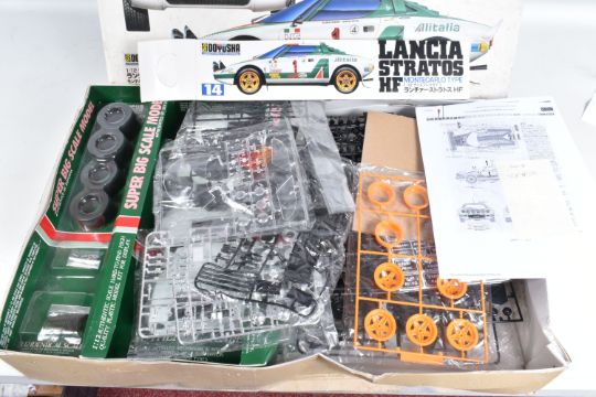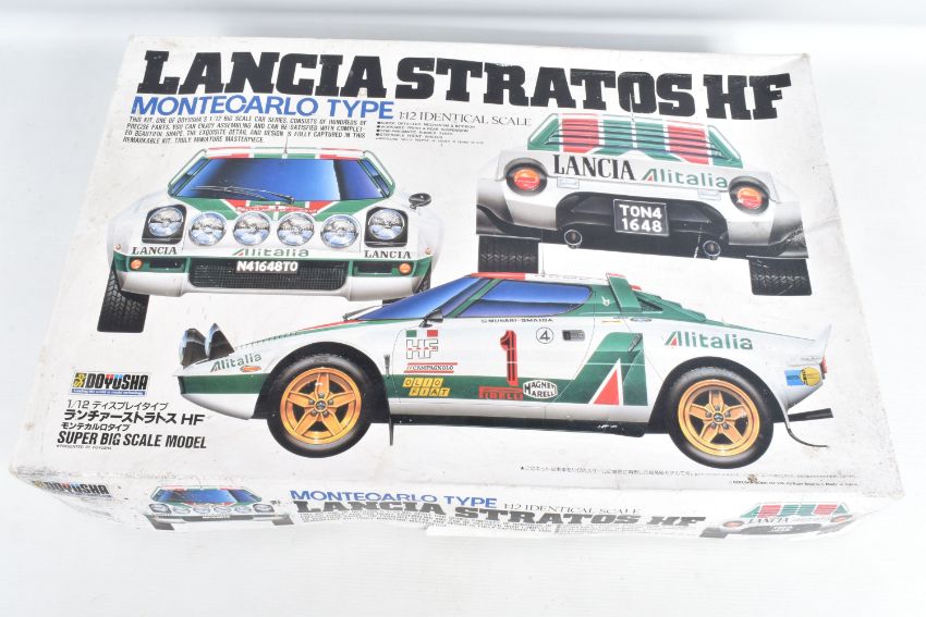 A BOXED 1:12 SCALE DOYUSHA MONTECARLO TYPE LANCIA STRATOS HF UNBUILD KIT, numbered 14, parts mostly look to be sealed in their original bags and attached to sprues, copy instructions included, box in a poor condition with signs of poor storage, creases etc unsure if complete but looks to be well stocked