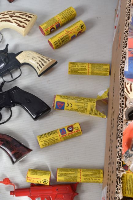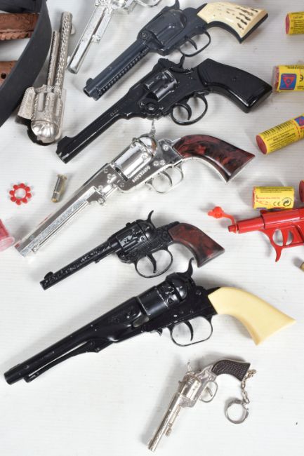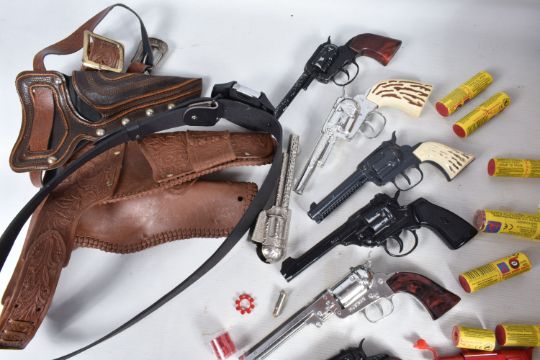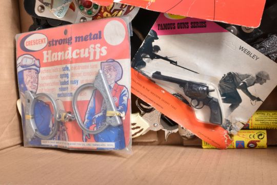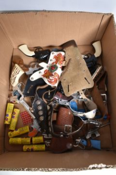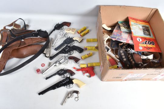 A QUANTITY OF UNBOXED AND ASSORTED PLAYWORN CAP GUNS AND ACCESSORIES, to include B.C.M. Mustang, Lone Star Peacemaker, Lone Star Deputy Dan, Replicast Remington, Lone Star Spud Gun, No.504, Crescent Dakota, Commando, Rustler Range Hip-Gun, other examples by Daisy, Kusan etc., none tested but all appear playworn, majority appear complete and in fairly good condition, but some with missing items, minor paint loss, marking and wear, with a Coibel Official James Bond 007 Secret Agent set, missing Thunderball pistol but still with Secret Agent Identification Card on original damaged backing card, two Crescent Famous Guns Series guns, still sealed on original damaged backing cards, Belt with buckle containing a lighter, assorted Holsters, Lone Star Riders and other pairs of Spurs, quantity of rolls of caps etc., due to the nature of this lot we cannot ship, successful bidder should collect themselves or hire their own courier (2 boxes)