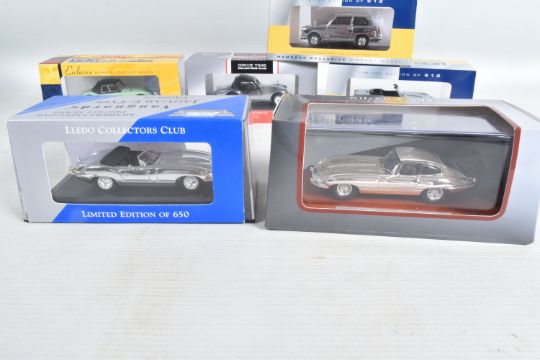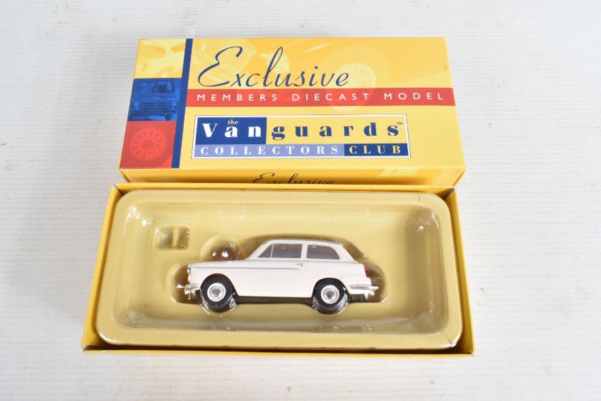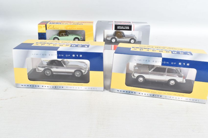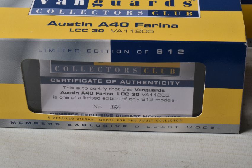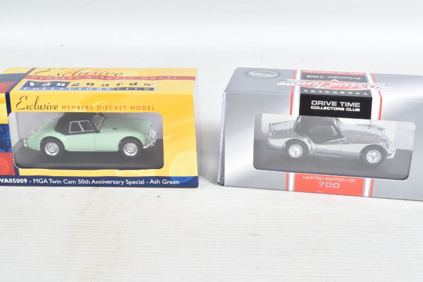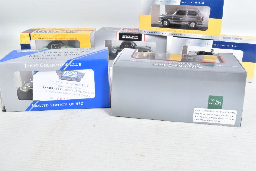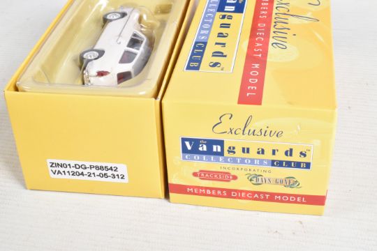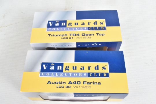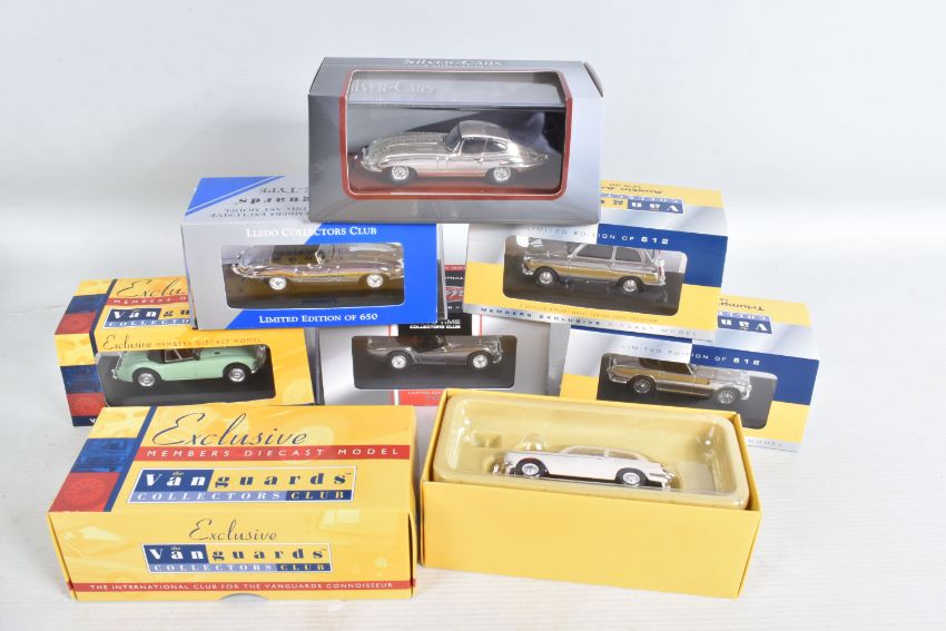 SIX BOXED VANGUARDS COLLECTORS CLUB EXCLUSIVE DIECAST MODEL CARS, Austin A40 Farina Saloon, 2010 Model no. VA11204, Drive Time Collectors Club Triumph TR3, LCC 19 no. VA04704, Austin A40 Farina LCC 30 no. VA11205, MGA Twin Cam 50th Anniversary Special, no. VA05009, Triumph TR4 Open Top LCC 31 no. VA115055, Jaguar E-Type, no. VA049 08, all with limited edition certificate/certificate of authenticity as appropriate, with an Atlas Editions Silver Cars Collection Jaguar E Coupe no. 7687103, all models appear in good condition and still attached to plinths, outer cardboard boxes in good condition showing only slight wear to corners and edges, contents have not been checked for completeness (7)