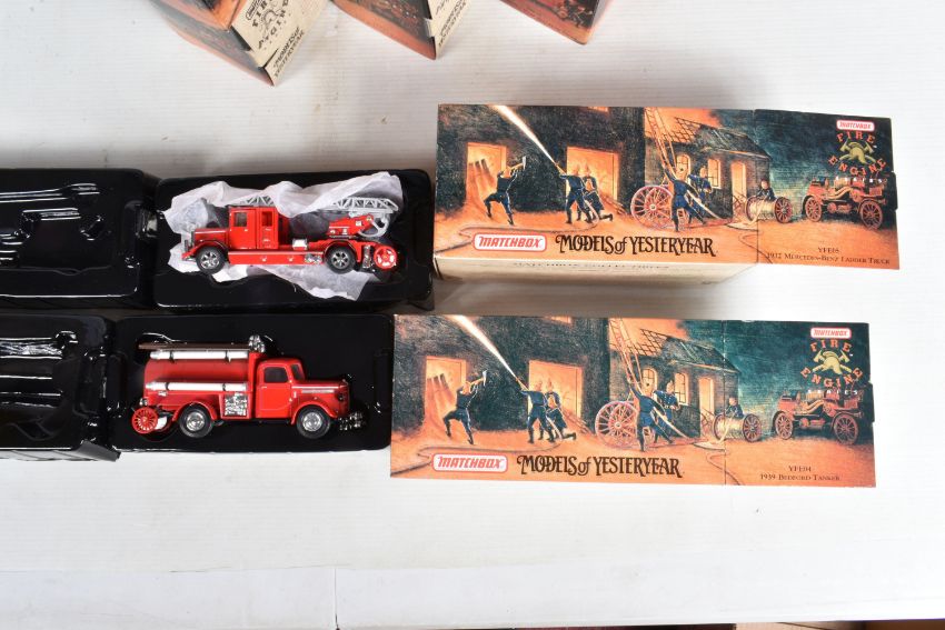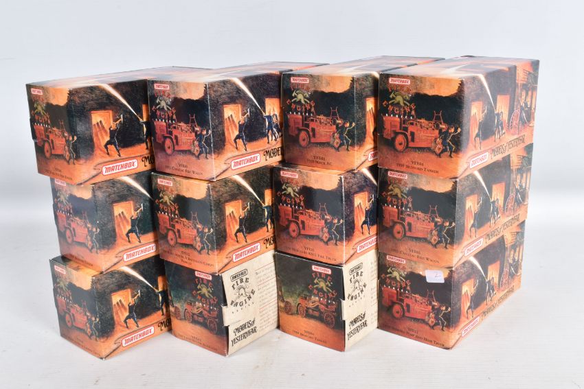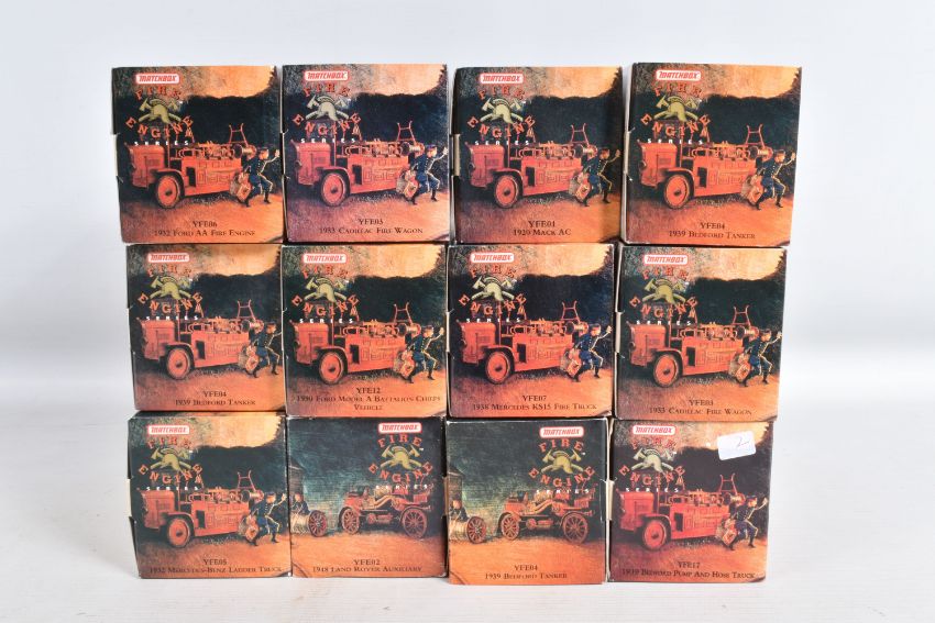 A QUANTITY OF BOXED MATCHBOX MODELS OF YESTERYEAR FIRE ENGINE SERIES, all are from 1920 to 1948, to include a 1920 Mack AC no. YFE01, a 1932 Ford AA no. YFE06, a 1930 Ford Model A Battalion Chief no. YFE12, a 1932 Merc Ladder Truck no. YFE05, two 1933 Cadillac fire Wagon no. YFE03, a 1938 Merc KS15 Fire Truck no. YFE07, two 199 Bedford Tanker no. YFE04, a 1939 Bedford Pump and Hose Truck no. YFE17, and a 1948 Land Rover Auxiliary no. YFE02, all models appear in new condition housed inside plastic casing, outer cardboard boxes in good condition showing only slight wear and with what appears to be cataloguing stickers, contents have not been checked for completeness (12)