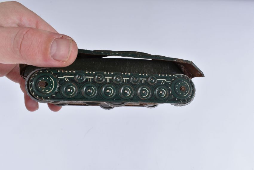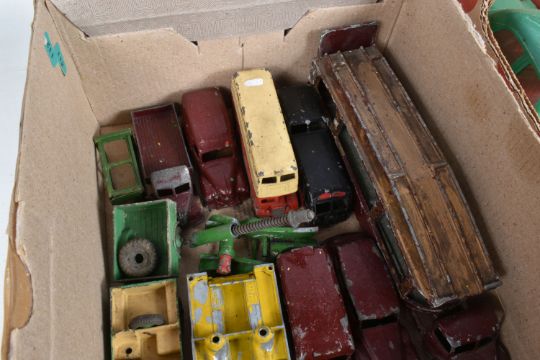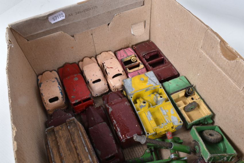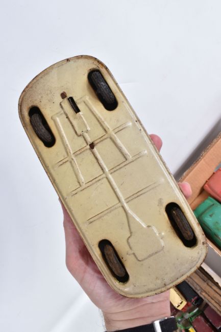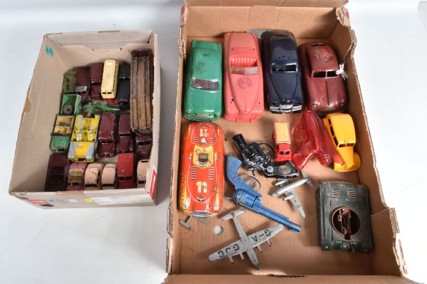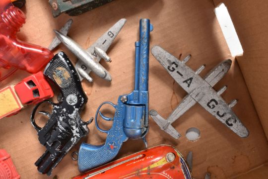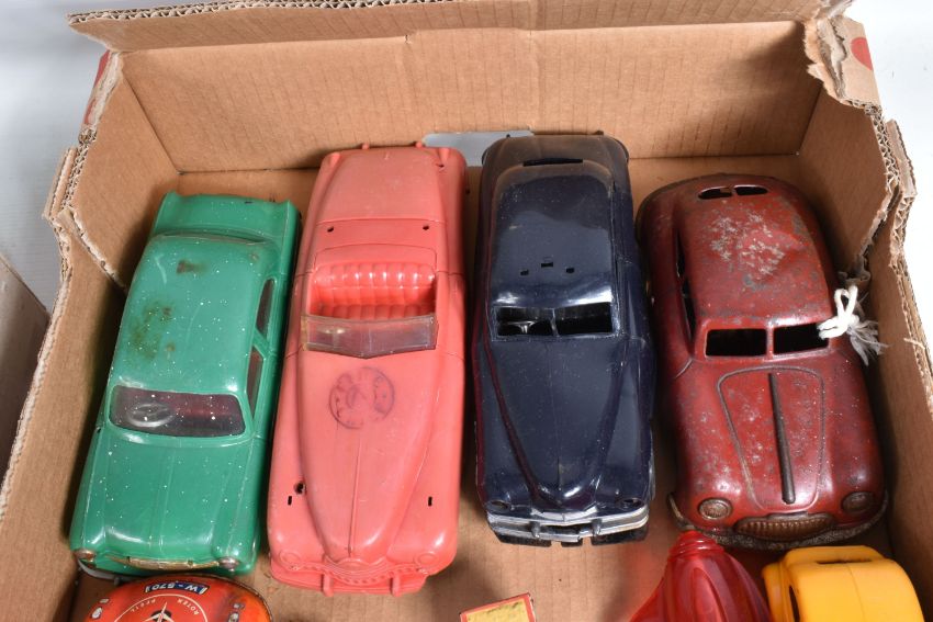 A QUANTITY OF UNBOXED AND ASSORTED PLAYWORN DIECAST, TINPLATE AND PLASTIC VEHICLES AND OTHER TOYS, to include Gescha Sixmobil tinplate clockwork car, Nr.557, made in West Germany, model loosely based on a Porsche 356, red body with plated trim, with key, motor runs ok but other features not tested, play worn condition with minor damage including dent to roof, paint loss, surface rusting, marking and wear, a Wueco tinplate friction drive 'Red Arrow' racing car, marked 'Made in Western Zone Germany', RN11, friction drive works intermittently , missing driver, with some paint loss, marking and wear, a green plastic friction Ford Consul saloon car, possibly Mettoy as carries registration MTY 890, missing n/s front wheel, part of front bumper and ariel, friction drive not working, marking and wear to bodyshell and trim, Marx (Gt. Britain) plastic friction drive 'Fire Chief' car, missing various items and has damage to front bumper, friction motor not working, some fading to plastic bodyshell, a plastic friction drive with battery operated headlamps Police? car, possibly Tri-ang, marked 'Made in Great Britain' but has no other mark, black plastic body loose on chassis, has some damage, is missing lamp lenses and other items and some has some deformation to the plastic, motor works fine, chassis with some surface rusting, yellow plastic friction drive Taxi, unmarked has some deformation to plastic body, motor works fine, Lone Star 'Dragnet' and 'Peacemaker' cap guns, H.R. Productions 'Automatic' plastic water pistol, in fairly good condition but trigger stiff, quantity of assorted mainly Dinky Toys diecast vehicles, majority repainted, due to the nature of this lot we cannot ship, successful bidder should collect themselves or hire their own courier (2 boxes)