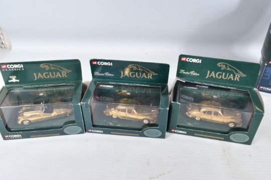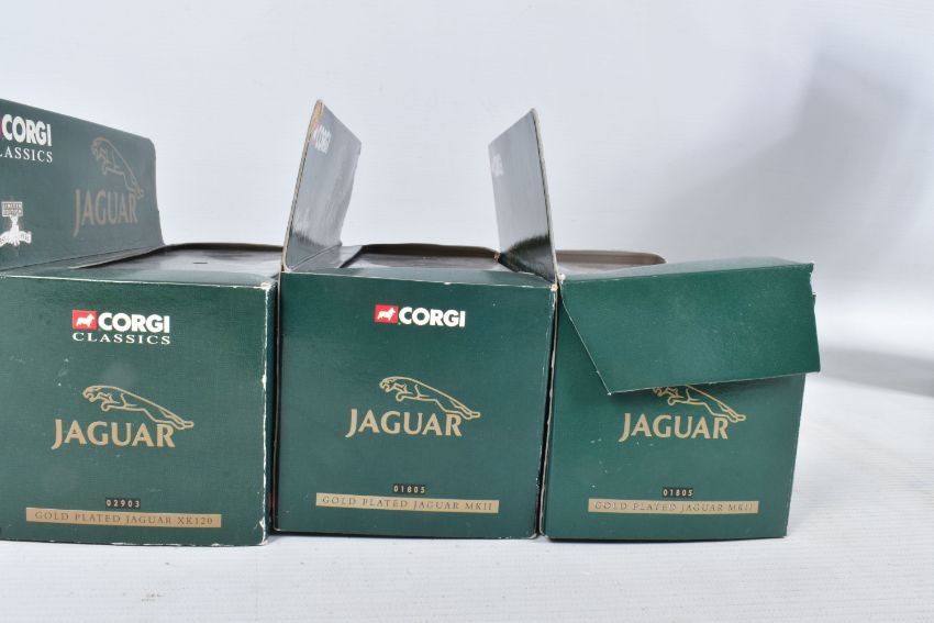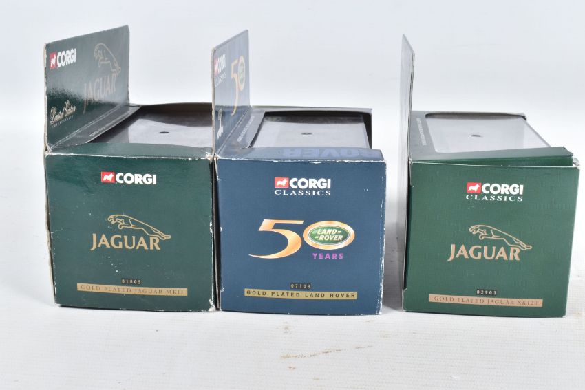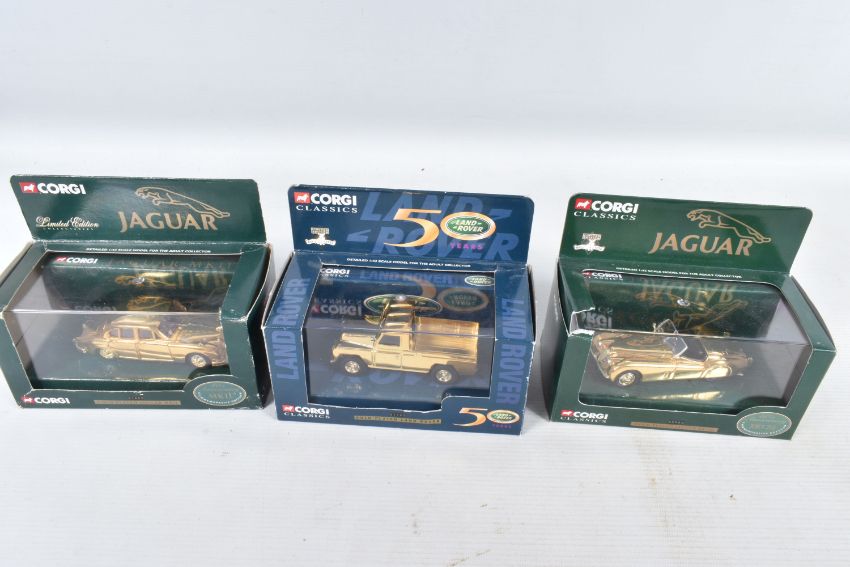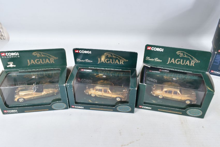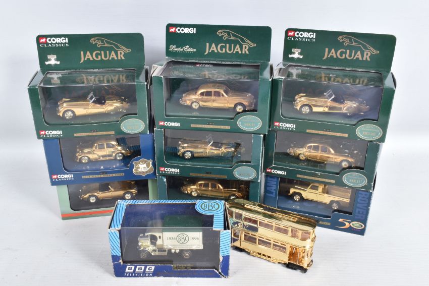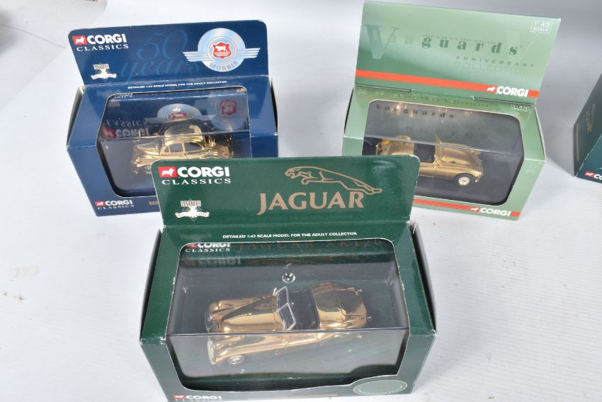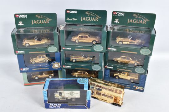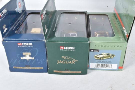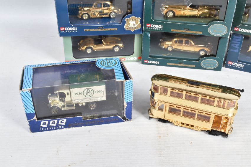 A TRAY OF BOXED AND UNBOXED DIECAST GOLD PLATED MODEL VEHICLES, to include a BBC television sixty years of television model, an unboxed Corgi model numbered CC25207, a selection of Corgi Classics models to include model numbers 02903, 01805, 07103, 02002, 01805, 02903, 02903, 01805 and a Corgi Vanguards model numbered VA 05007, all models appear to be in good condition however contents has not been checked for their completion, housed inside their plastic casing and outer cardboard boxes, outer boxes are in varying conditions from some being very good to some with tears, broken panels and scuffs and scratches etc