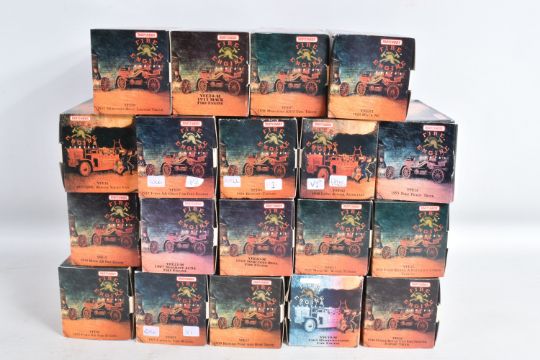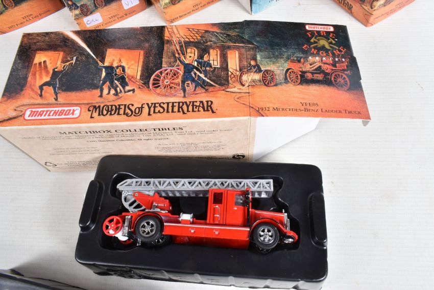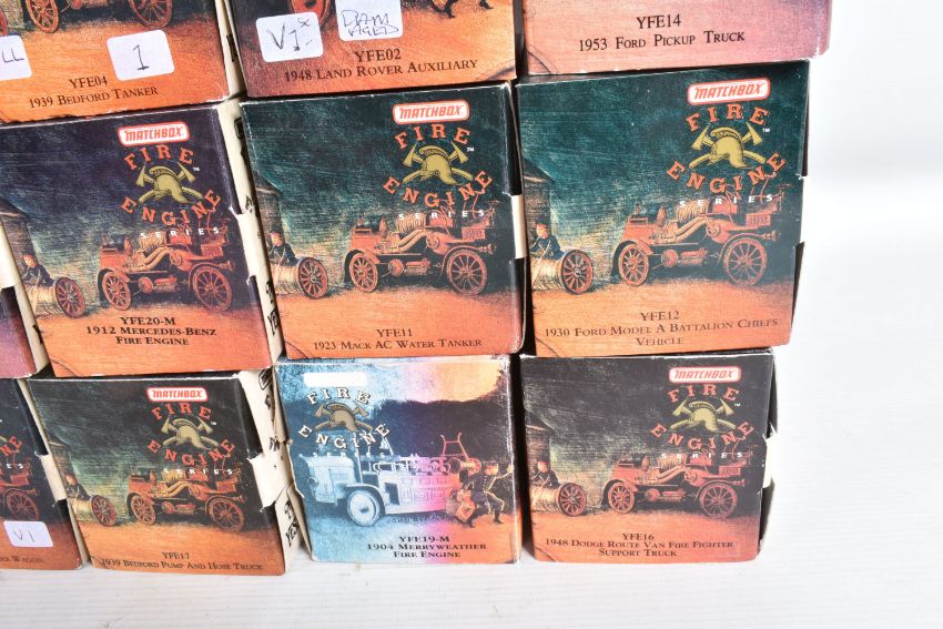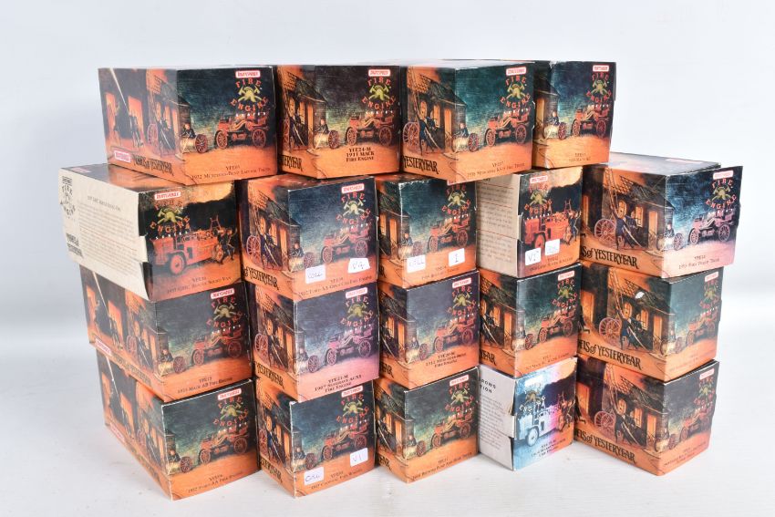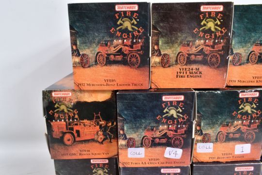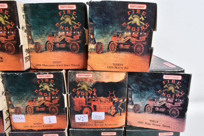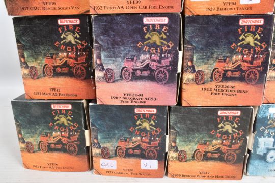 NINETEEN BOXED MATCHBOX MODELS OF YESTERYEAR FIRE ENGINE SERIES, from the 1920's to 1950's, to include model no.'s YFE01, YFE02, YFE03, YFE04, YFE05, YFE06, YFE07, YFE09, YFE10, YFE11, YFE12, YFE14, YFE15, YFE16, YFE17, YFE19-M, YFE20-M, YFE21-M, and YFE24-M, all models appear in new condition housed inside plastic casing, outer cardboard boxes in good condition showing only slight wear with what appears to be cataloguing stickers, contents have not been checked for completeness