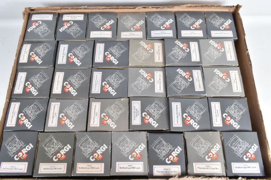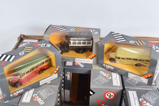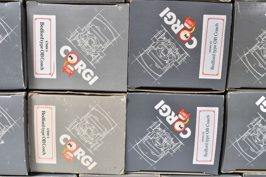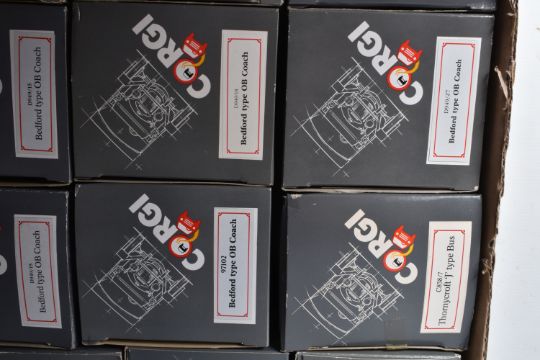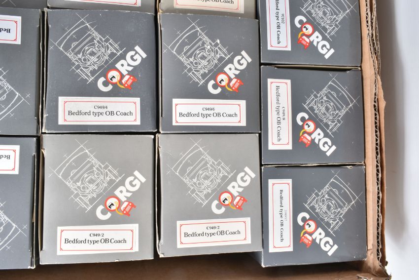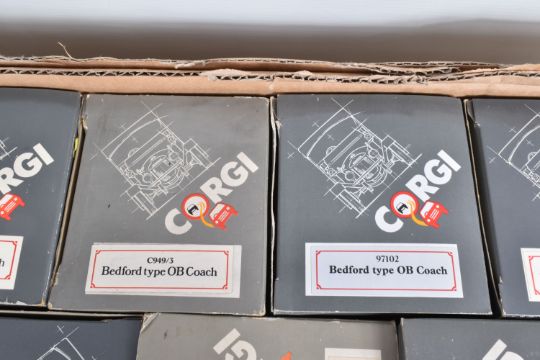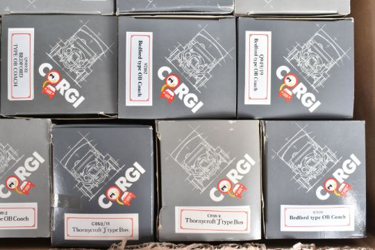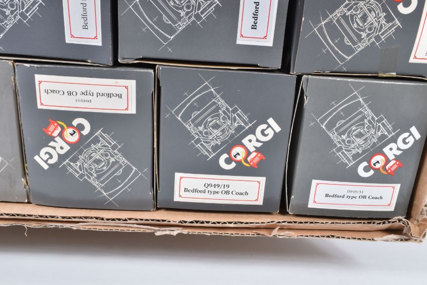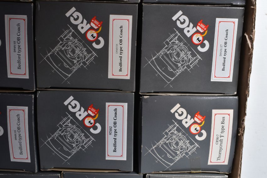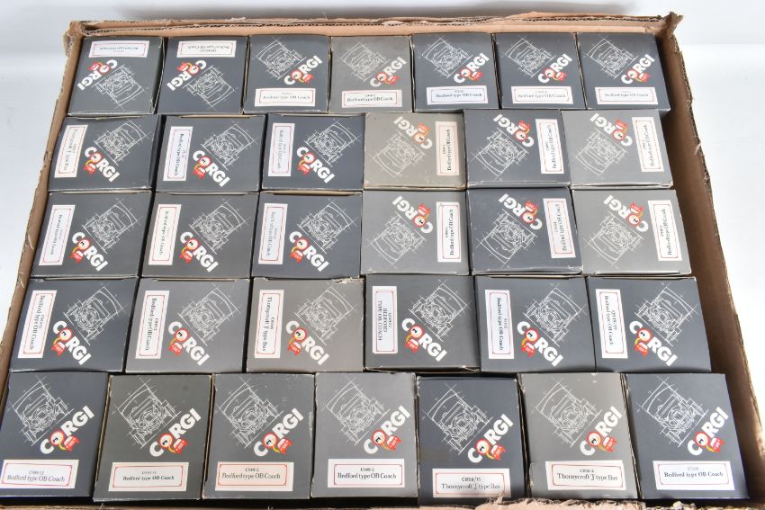 THIRTY TWO BOXED CORGI CLASSICS DIECAST MODEL COACHES, to include twenty eight Bedford type OB Coaches, model numbers are C949/1 (2), C949/2 (5), C949/3, C949/4, C949/6, C949/8, C949/11, C949/12, D949/13, D949/15 (2), D949/17, D949/18, D949/27, D949/31 (2), Q949/19 (2). Q949/22, 97100, 97102 (3), and four Thornycroft 'J' type Buses, model numbers are C858/4, C858/6 C858/7. C858/11, all models appear in good condition, outer cardboard boxes in good condition showing only slight wear, contents have not been checked for completeness
