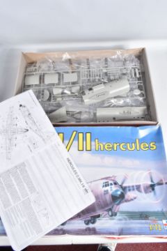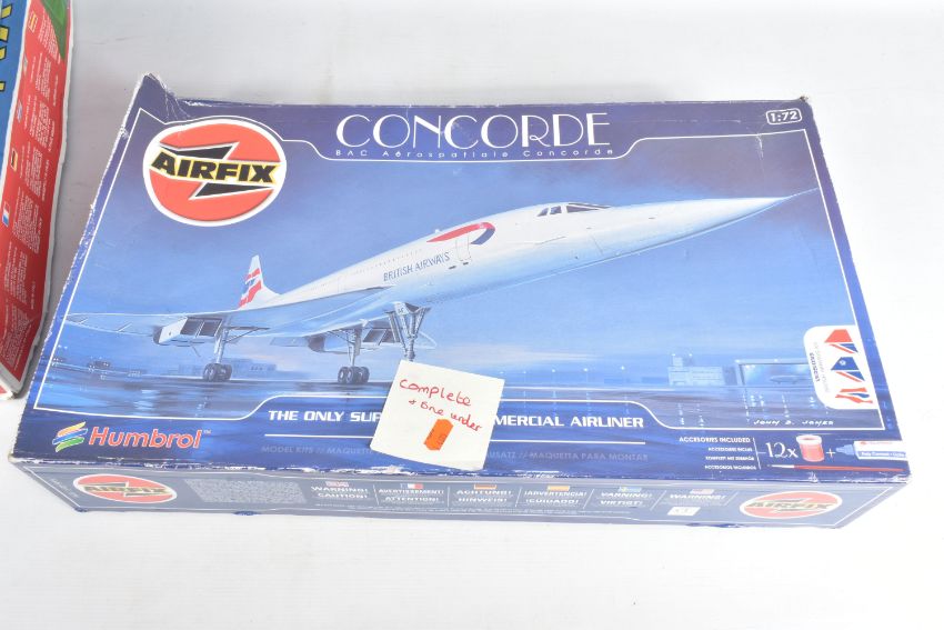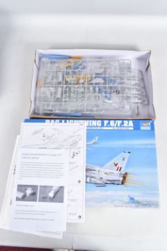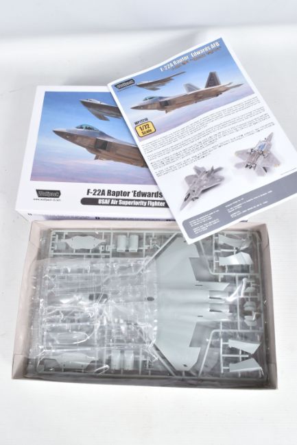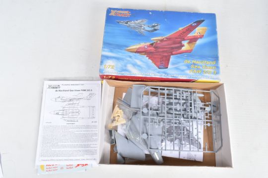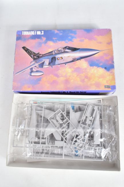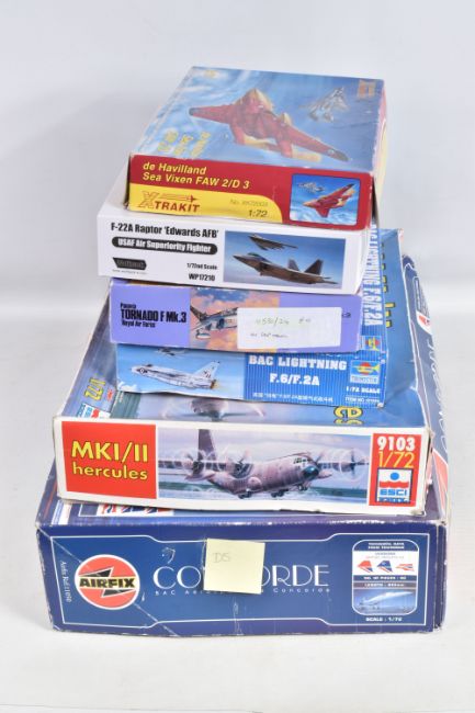 SIX BOXED MILITARY AIRCRAFT 1:72 SCALE UNBUILT MODEL KITS, to include a Hasegawa Hobby Kits Tornado F Mk.3, with instructions, decals, pieces in factory sealed bag, item no. 04031, an XTrakit de Havilland Sea Vixen FAW.2, includes instructions decals, pieces loose in box, some attached to sprues, also has to unopened Modelworks decals, item no.XK72003, a Wolfpack F-22A Raptor 'Edwards AFB' USAF Air Superiority Fighter, with instructions and pieces in factory sealed bags, like new, item no. WP17210, a Trumpeter BAC Lightning F.6/F.2, with instructions, partial built, pieces loose in box and some in bag attached to sprues, item no. 01654, an ESCI ERTL MKI/II Hercules, with instruction, pieces loose, attached to sprues and some in bags, item no. 9103, and an Airfix Concorde BAC Aerospatiale Concorde, with instructions, pieces in factory sealed bags, item no. 11050, the kits have not had contents checked for completion, outer boxes appear in fair to good condition, there are signs of wear with peeling corners, scuffs to edges and some boxes with slight crushing