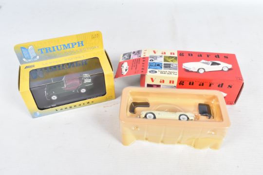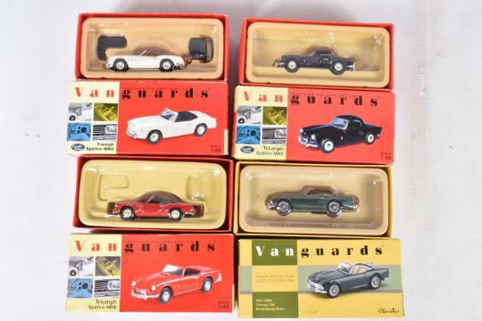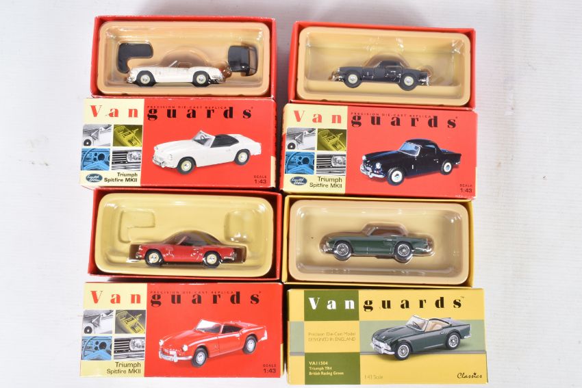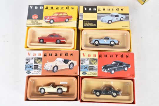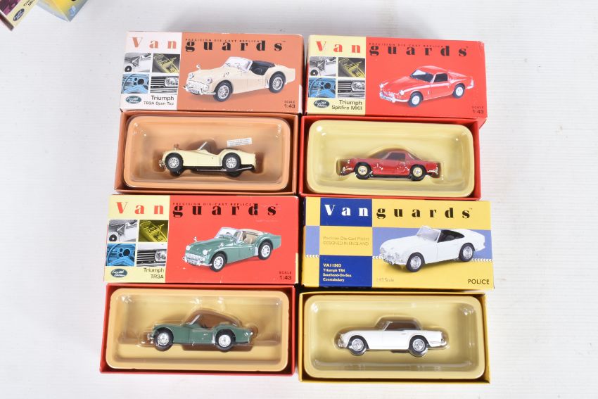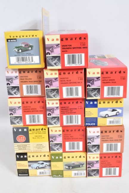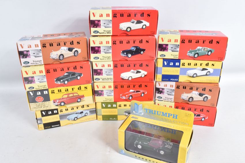 FOURTEEN BOXED 1:43 SCALE DIECAST VANGUARDS TRIUMPH MODEL VEHICLES, to include two Pale Yellow TR3A Open Top no. VA47000, a Signal Red Spitfire MKII no. VA06701, a White Spitfire MKII no. VA06706, an Apple Green TR3A no. VA04701, a Royal Blue Spitfire MKII no. VA06704, a Signal Red Spitfire MKII no. VA06700, a Jasmine Yellow Spitfire MKIII Soft Top no. VA06707, a Conifer Green Spitfire MKII no. VA06702, a British Racing Green TR4 no. VA11504, a British Racing Green TR3A no. VA04703, a TR4 Police Vehicle no. VA11503, a Red Herald no. VA5000, and a 1964 Alpine Rally Spitfire MKI no. VA06712, all models appear in new condition housed inside plastic casing, outer cardboard boxes in good condition showing only slight wear, contents have not been checked for completeness