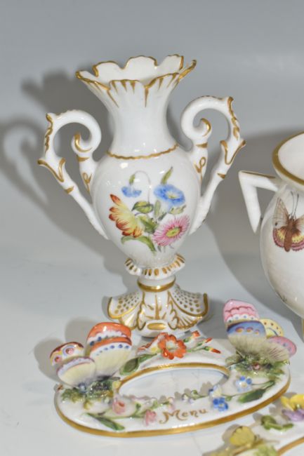 A GROUP OF FIVE NINETEENTH CENTURY PIECES OF ROYAL CROWN DERBY TABLEWARE, comprising a cauldron decorated with butterflies and insects on a white ground with gilt detail, a two handled vase decorated with hand painted floral spays and gilt detail, height 11.5cm, both have red Stevenson & Hancock backstamp, together with three menu card holders decorated with applied flowers and butterflies, backstamps vary (5) (Condition Report: two menu holders have chipped wings and petals, gilt rim on cauldron is a little worn, vase has a firing crack around base of pedestal)