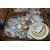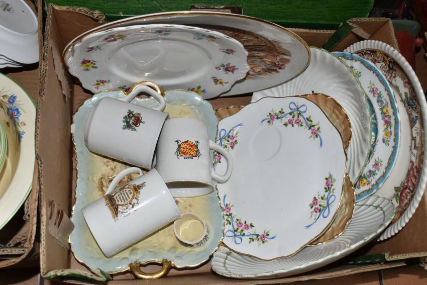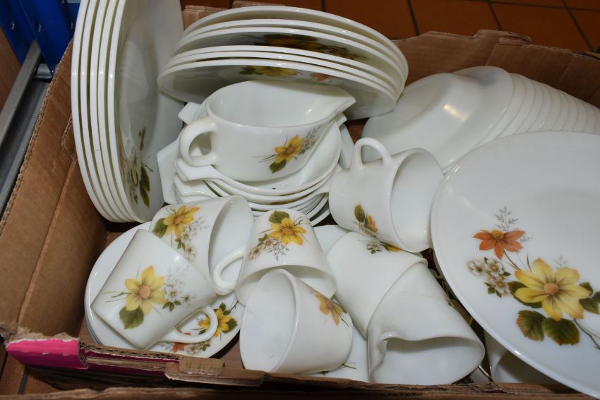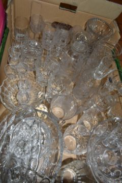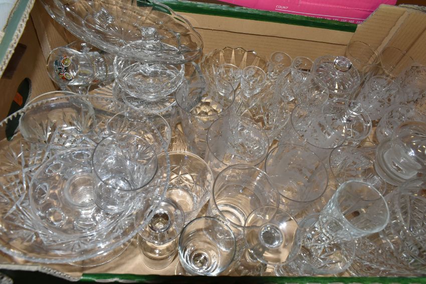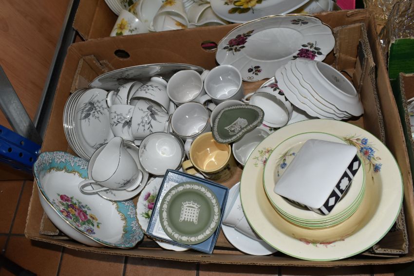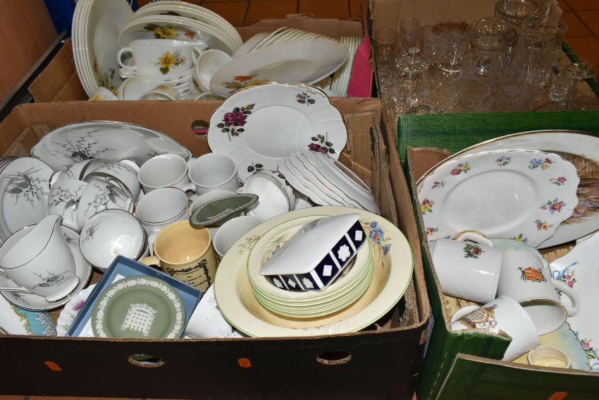 FOUR BOXES OF MIXED CERAMICS AND GLASSWARE to include a box of JAJ Pyrex Autumn Glory dinner wares comprising plates, bowls, teacups, a sauce boat, etc, a box of mixed ceramic tea wares to include a Royal Crown Derby Unfinished Imari lidded trinket pot, Royal Albert Highland Thistle saucer, and an Old Country Roses saucer, a boxed Wedgwood sage green jasperware Westminster trinket dish and second heart shaped trinket dish, a quantity of mixed teacups, a box of crystal cut glassware to include assorted aperitif glasses, whiskey tumblers, a decanter, a lidded jar, rose bowl, etc, (4 boxes) (s.d)