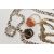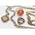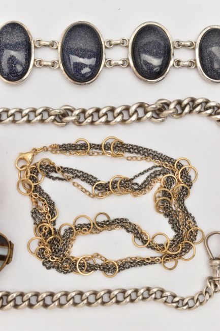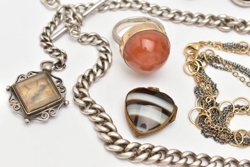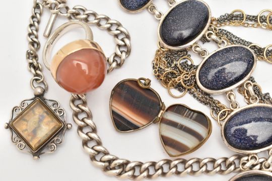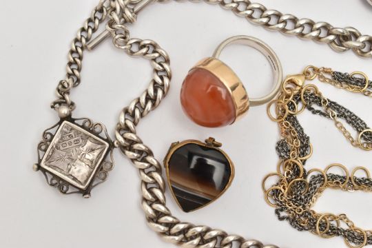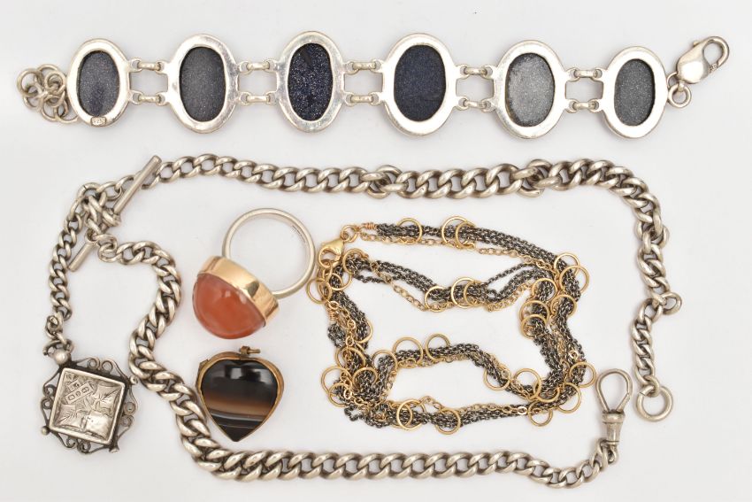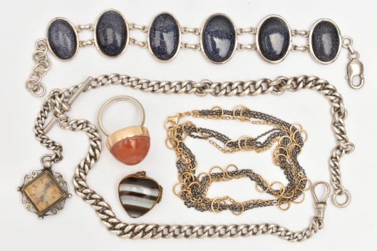 A SMALL ASSORTMENT OF JEWELLERY, to include a silver double Albert chain, links with rubbed stamps, fitted with a lobster clasp rubbed sterling mark, jump ring and T-bar makers mark B&S, suspending a silver compass fob, hallmarked Birmingham 1895, approximate gross weight 60.7 grams, a white metal bracelet set with blue goldstone cabochons, lobster clasp stamped 925, a large silver and carnelian cabochon ring, hallmarked Birmingham, a brown banded agate heart shape locket pendant, in a base metal mount, and a bi-colour necklace stamped 925