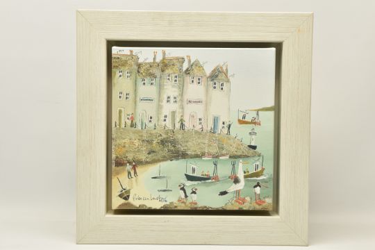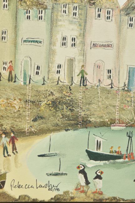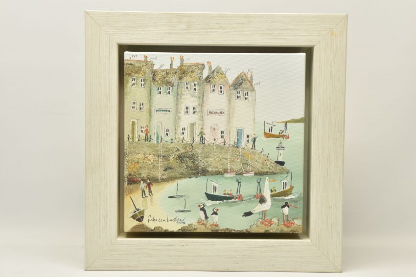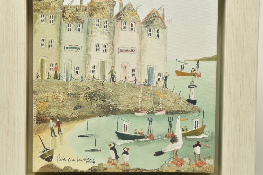 REBECCA LARDNER (BRITISH CONTEMPORARY) 'QUAYSIDE I', a signed limited edition print on canvas depicting a seaside village, 132/195 with certificate verso, approximate size 30cm x 30cm, frame size 44cm x 44cm, Condition Report: small dents to the frame