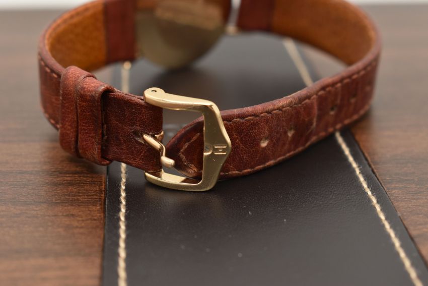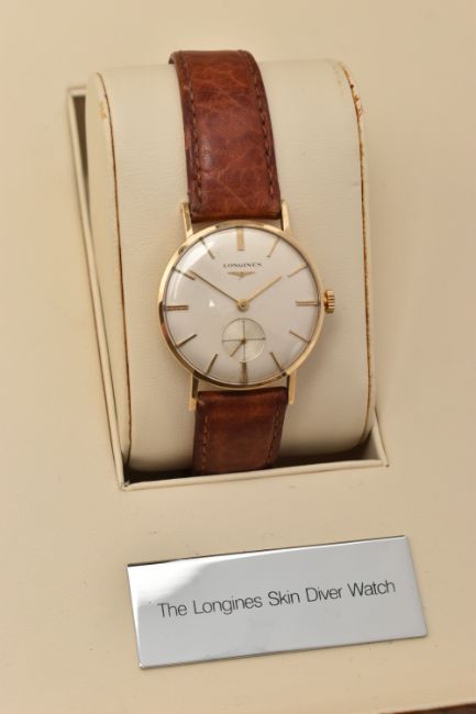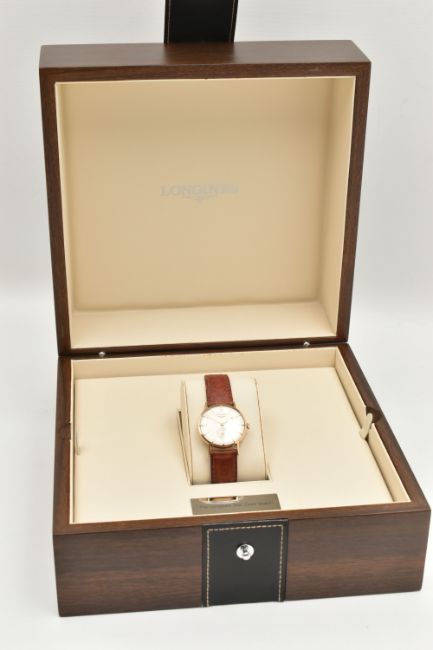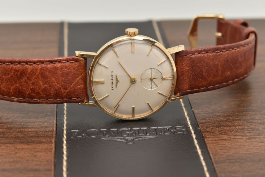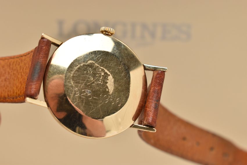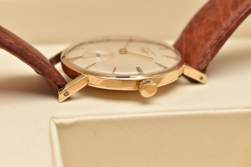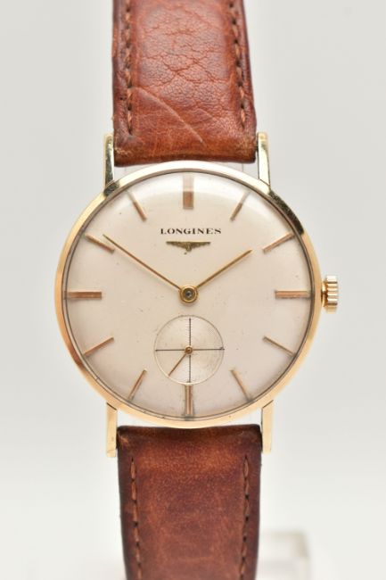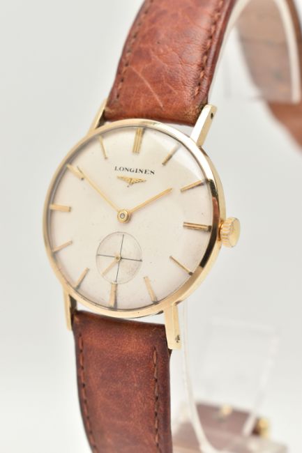 A 9CT GOLD LONGINES WRISTWATCH, the circular face with baton hour markers and subsidiary seconds dial, to the tan leather strap, personal engraving to the reverse, 9ct hallmark for London 1963, inner case stamped Baume 27206, approximate face diameter 30mm, approximate weight of case back 4 grams, with an associated maker's box (condition report: overall good condition, minor scratches to the face, minor debris beneath the glass, moderate scratches to the back and moderate wear to the strap, watch box is not for this model but is in good condition, we cannot guarantee the working order of any watch)