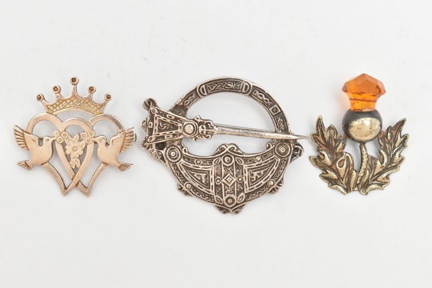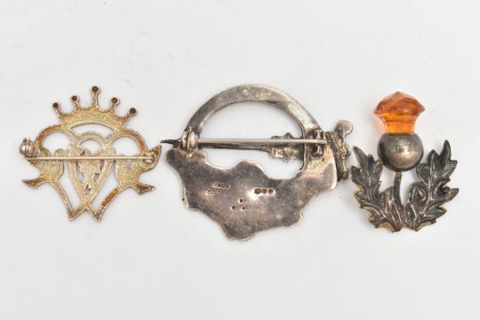 THREE SCOTTISH BROOCHES, to include an orange paste thistle brooch, a silver crowned Lucken booth brooch, hallmark for Malcolm Gray for Ortak Silvercraft, a silver Tara design brooch, with silver hallmark, approximate lengths 34mm to 47mm, approximate total weight 27.3 grams