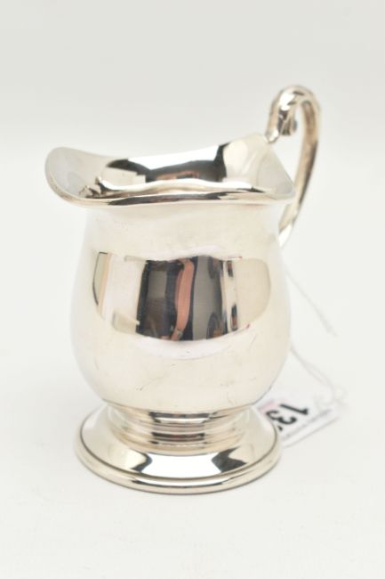 AN ELIZABETH II SILVER CREAM JUG, a plain polished baluster form cream jug with a scrolling handle, approximate height 95mm, hallmarked 'Israel Freeman & Son Ltd' Sheffield 1974, approximate gross weight 117.1 grams, 3.76 ozt, (condition report: general moderate wear, overall condition good)