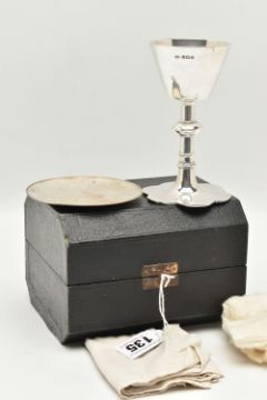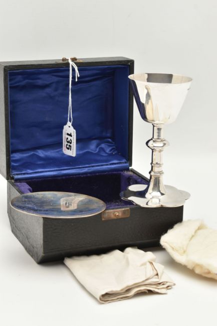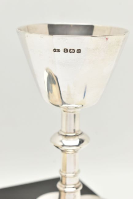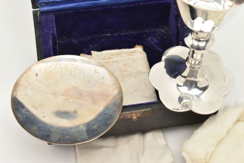 A CASED GEORGE V SILVER CHALICE SET, plain polished glass and plate, hallmarked 'Deakin & Francis Ltd' Birmingham 1933, approximate gross weight 187.2 grams, 6.02 ozt, together with a blue satin lined case, (condition report: general moderate wear, overall condition good)