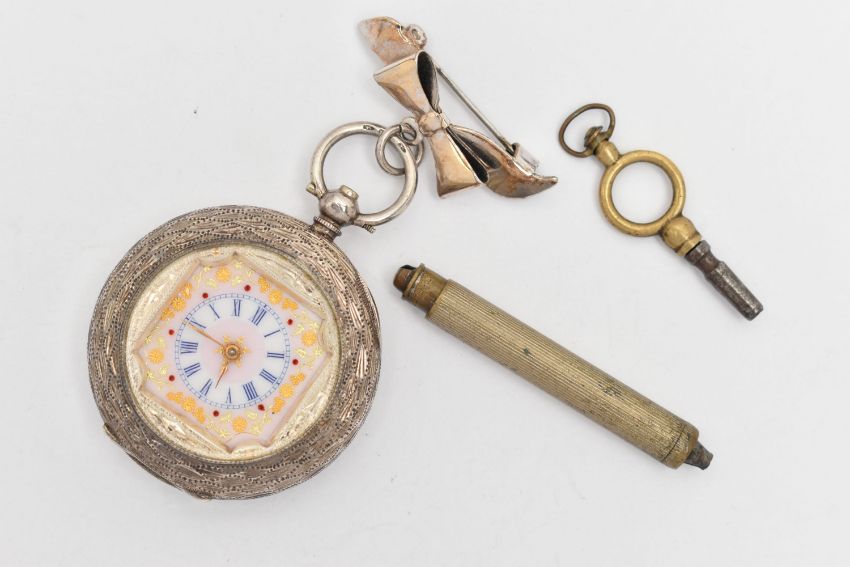 A LADIES WHITE METAL POCKET WATCH, key wound, round white Roman numeral dial with red and gold detailing, within a floral and foliate pattern case with vacant cartouche, inside case back stamped 0.935 Swiss silver control marks, numbered 490682, approximate case width 36.4mm, with a white metal bow brooch pin attached stamped '10k on sterling', together with two watch keys and a box (condition report: general light wear, not tested for working order, we cannot guarantee the working order of this watch)