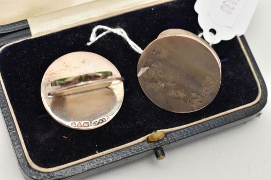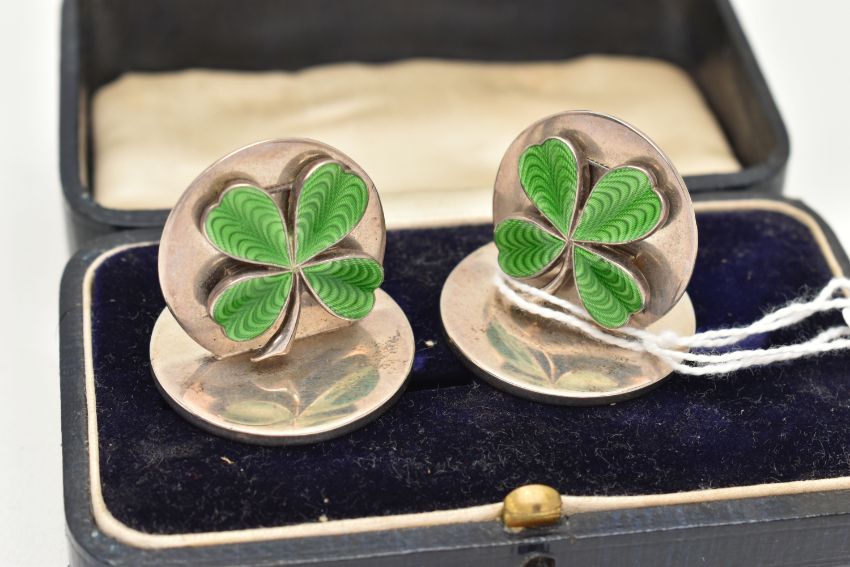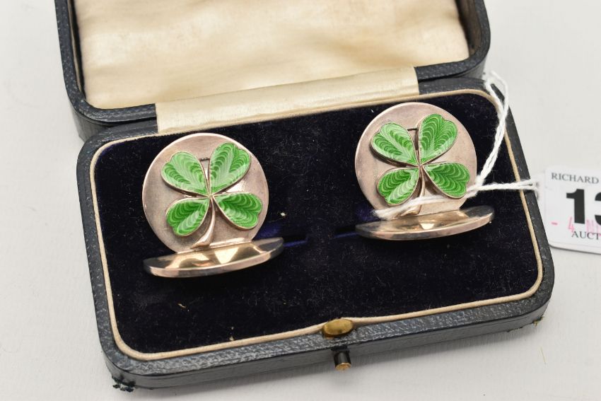 A PAIR OF EDWARD VII SILVER MENU PLACE HOLDERS, designed as two disks with four leaf clovers decorated with green guilloche enamel, hallmarked 'Sampson Mordan & Co Ltd' Chester 1907, approximate gross weight 58.8 grams, (condition report: general moderate wear, no damage to enamel, overall condition good)