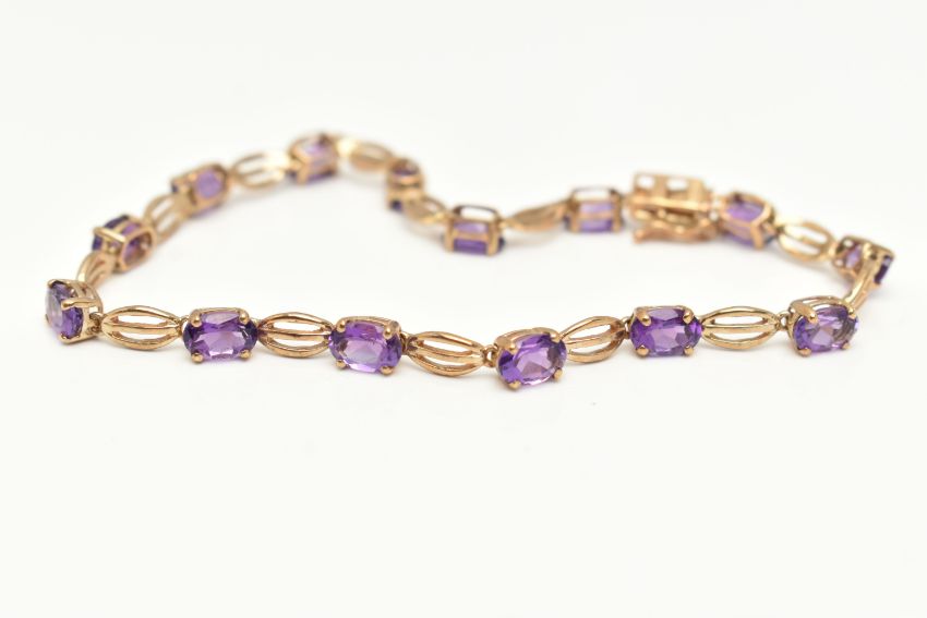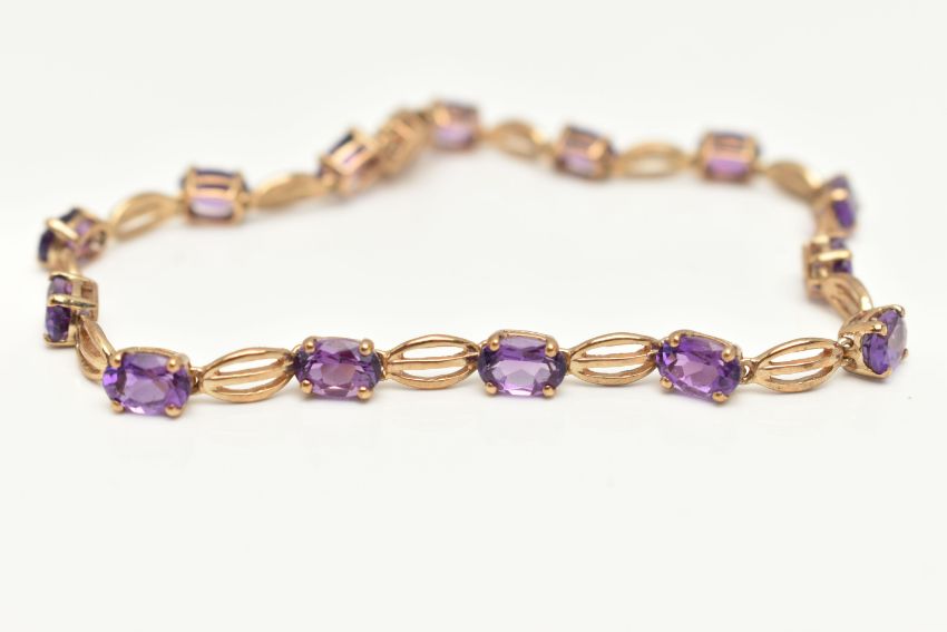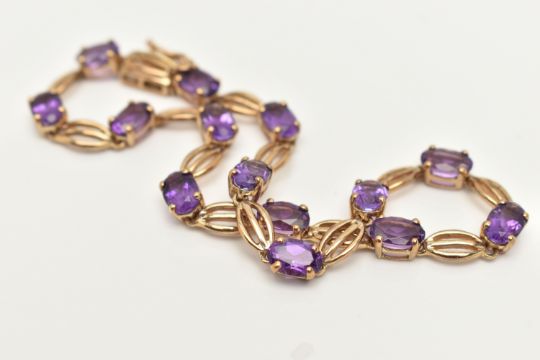A 9CT GOLD AMETHYST BRACELET, designed as oval amethysts in four claw settings interspaced by oval shape links, to the push piece clasp with figure of eight safety clasp, 9ct hallmark for Birmingham, approximate length 185mm, approximate weight 5.6 grams (condition report: overall good condition)