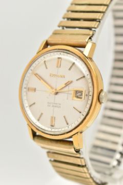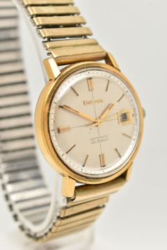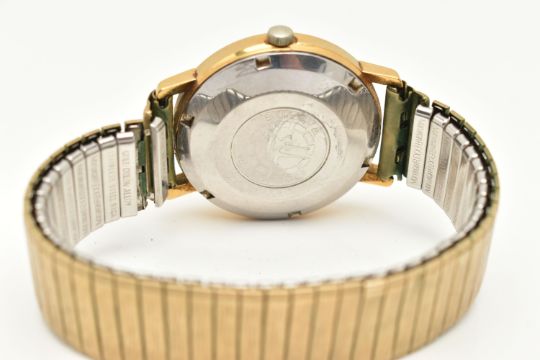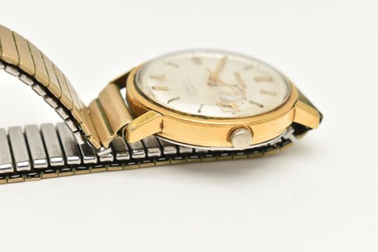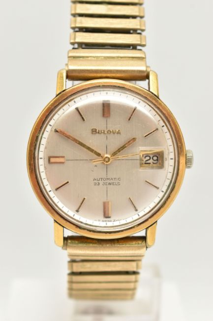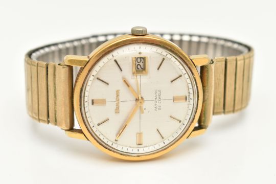 A GENTS GOLD PLATED 'BULOVA' WRISTWATCH, automatic movement, round silver dial signed 'Bulova, Automatic 23 Jewels', baton markers, date window at the three o'clock position, gold tone hands, within a gold plated case, stainless steel case back signed 'Bulova', screw down case back has not been removed, approximate case width 34.0mm, fitted with a gold colour alloy stretch link bracelet (condition report: not currently working may require some attention, light surface scratches to the cover, overall general light wear, would benefit from a gentle clean and polish, we cannot guarantee the working order of any watch)
