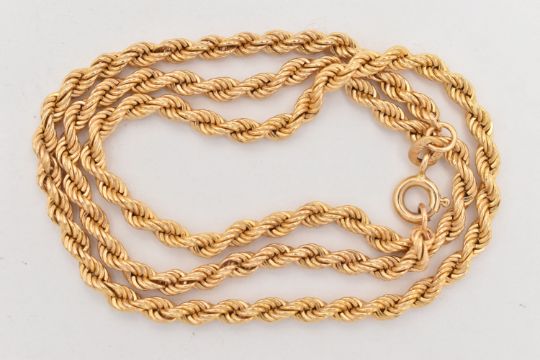 A 9CT GOLD CHAIN NECKLACE, a yellow gold rope chain, fitted with a spring clasp, approximate length 405mm, hallmarked 9ct London import, approximate gross weight 4.1 grams, (condition report: general moderate wear, overall condition good)