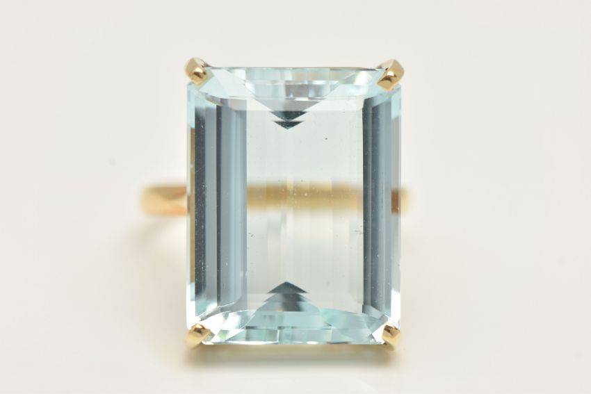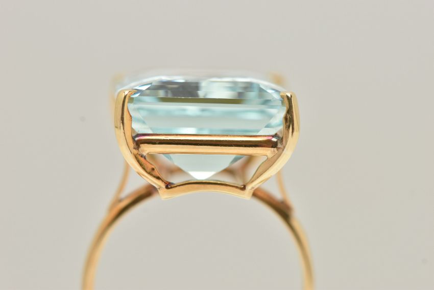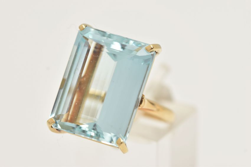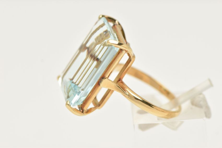 A LARGE AQUAMARINE DRESS RING, an emerald cut aquamarine, approximate total weight 37ct, approximate dimensions length 19.4mm x width 15.2mm x depth 18.5mm, four prong set in yellow metal, shank stamped 18k, ring size O 1/2, approximate gross weight 8.4 grams, (condition report: general light wear, some minor nicks to girdle)