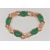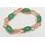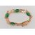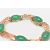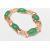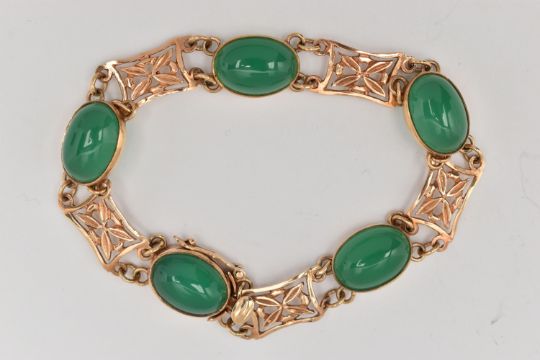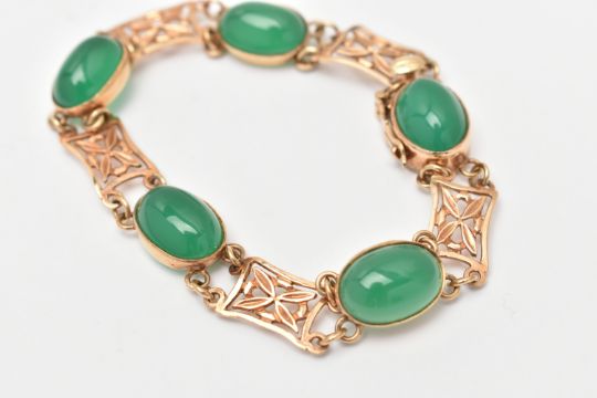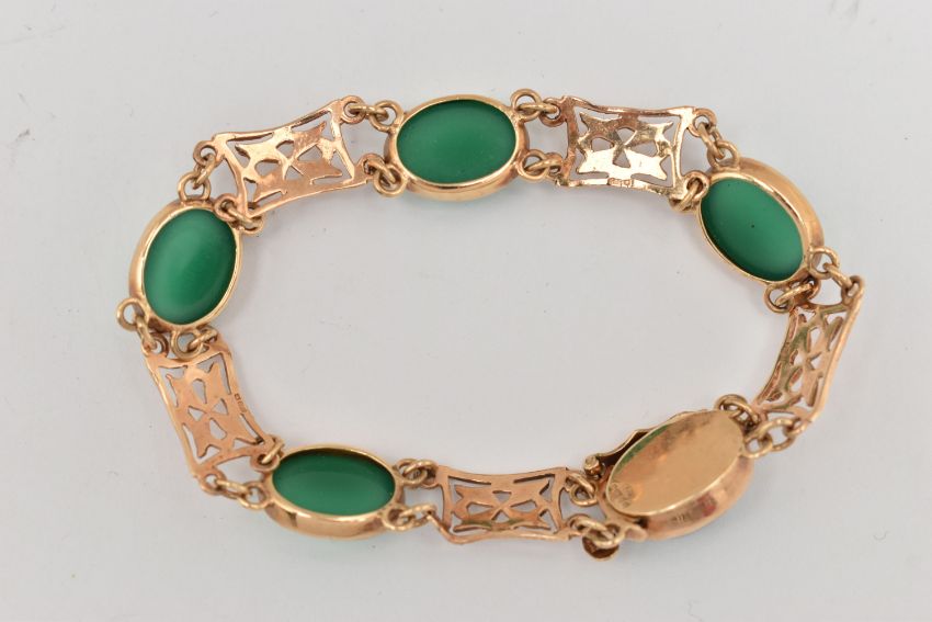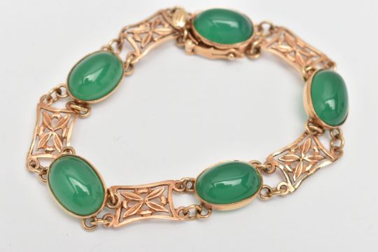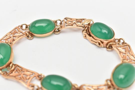 A 9CT GOLD GEM SET BRACELET, a rose gold bracelet designed as open work panels interspaced with five oval cabochon chrysoprase in collet settings, fitted with integrated push pin clasp, approximate length 190mm, hallmarked 9ct Birmingham 1975, approximate gross weight 15.5 grams, (condition report: general moderate wear some distortion to panels, overall condition good)