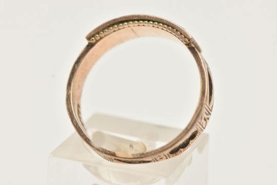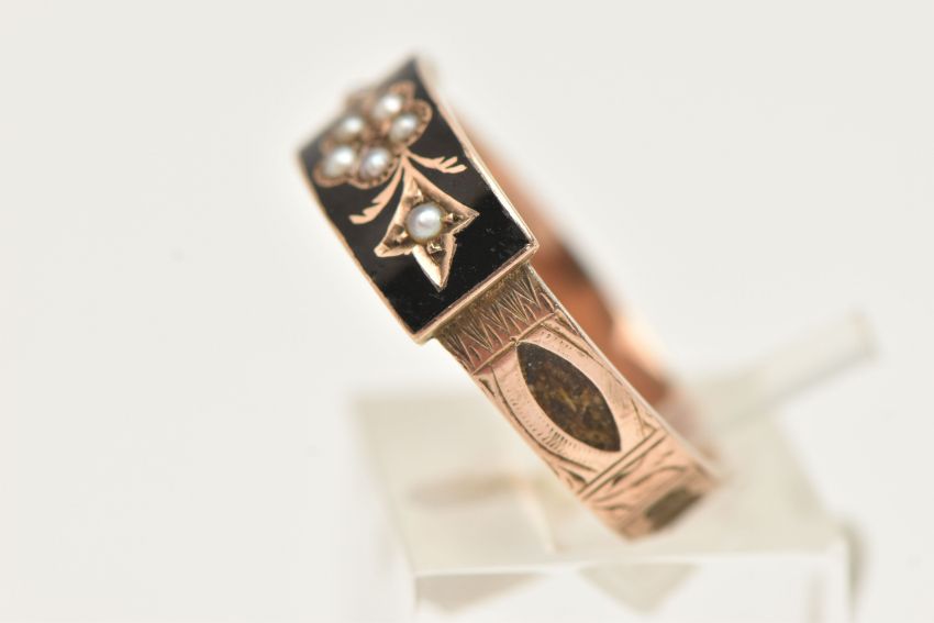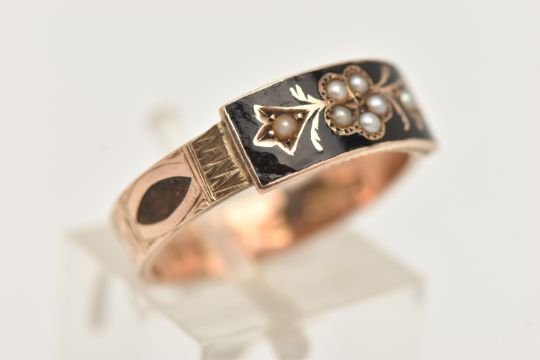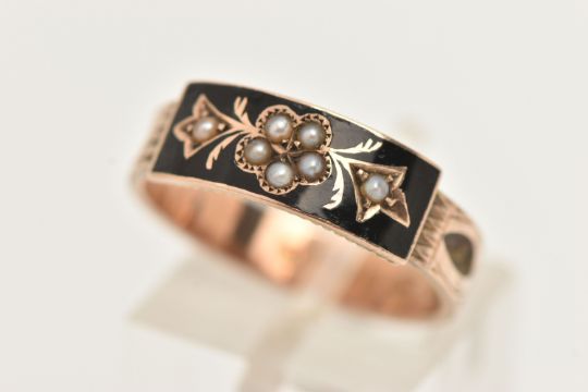 A LATE VICTORIAN SPLIT PEARL AND BLACK ENAMEL MEMORIAL RING, designed as a split pearl set flower within a black enamel surround, textured shoulders leading onto a woven hair set band, approximate band width 4.3mm, hallmarked 9ct Chester 1894, ring size leading edge P, approximate gross weight 2.4 grams (condition report: general light wear in keeping with age, would benefit from a gentle clean some dirt within the hair pieces, but overall condition good)