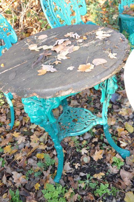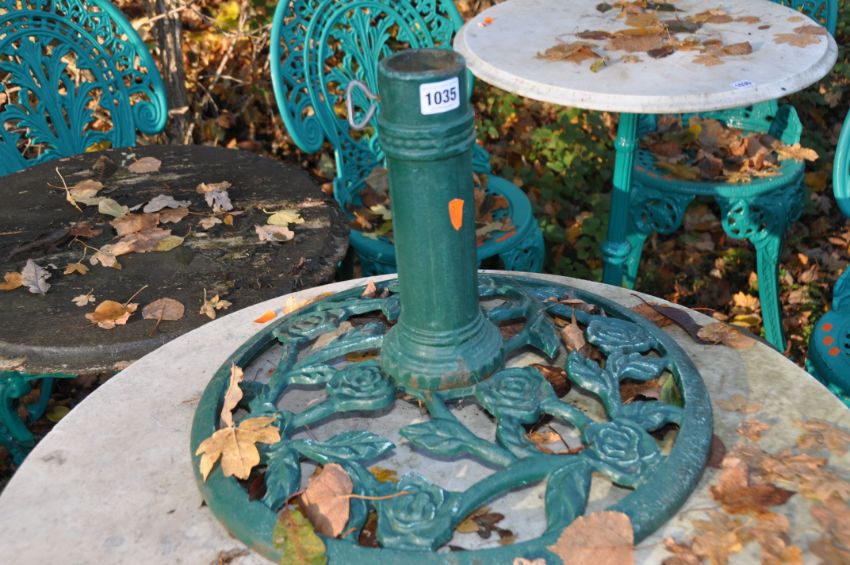 TWO VICTORIAN STYLE CAST IRON PUB TABLES, one with a white marble, 74cm round top, the other with a very weathered wooden top along with a parasol base (3)