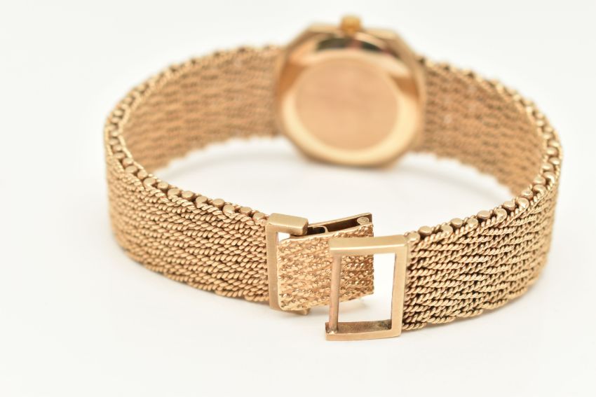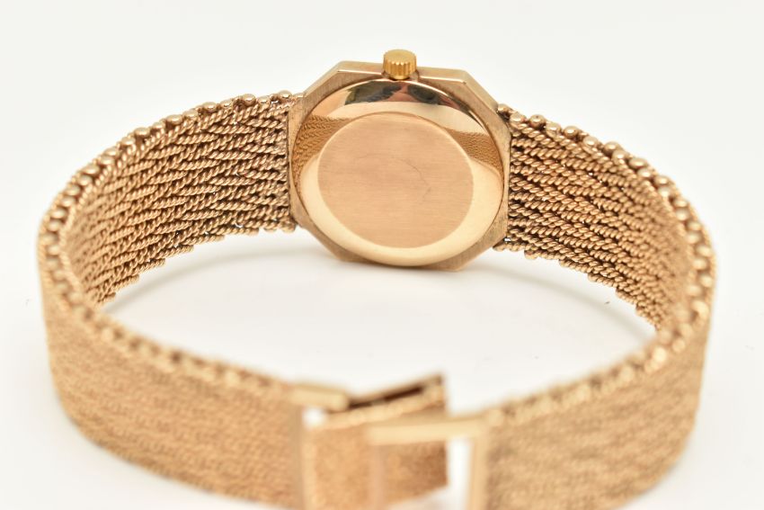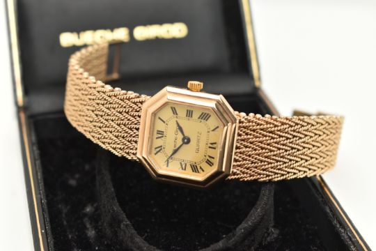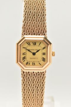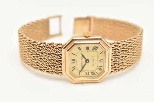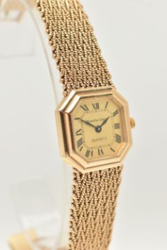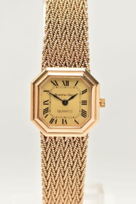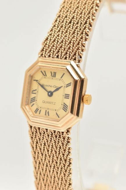 A LADIES 9CT GOLD 'BUECHE-GIROD' WRISTWATCH, quartz movement, square gold tone dial with cut off corners, signed 'Bueche-Girod Quartz', Roman numerals, blue steel hands, polished case, inside case back hallmarked 9ct London 1978, movement signed 'Bueche-Girod' numbered 950 011, approximate case width 23.4mm, fitted to a textured articulated bracelet and folding clasp, hallmarked 9ct London 1978, approximate gross weight excluding movement 46.3 grams, together with a signed 'Bueche-Girod' fitted box (condition report: watch not currently working may require a new battery, general light wear, clasp in working order, we cannot guarantee the working order of any watch)