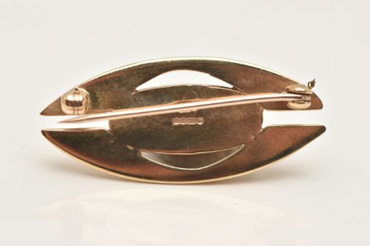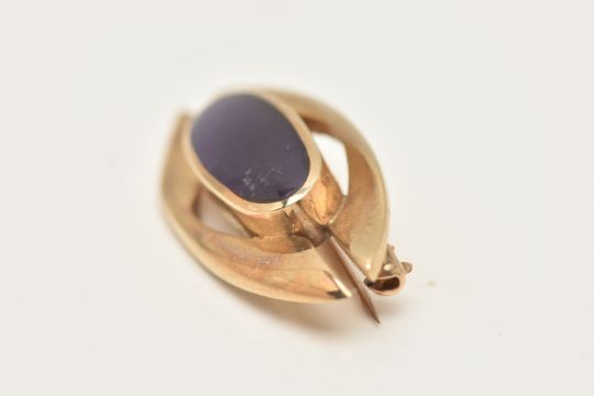 A 9CT GOLD AMETHYST BROOCH, designed as a central oval amethyst within a collet setting, to the split oval surround, 9ct hallmark for Sheffield, approximate length 35mm, approximate weight 6.4 grams (condition report: light general wear)