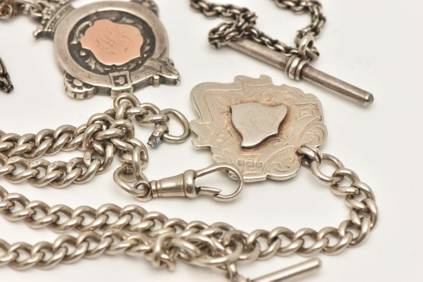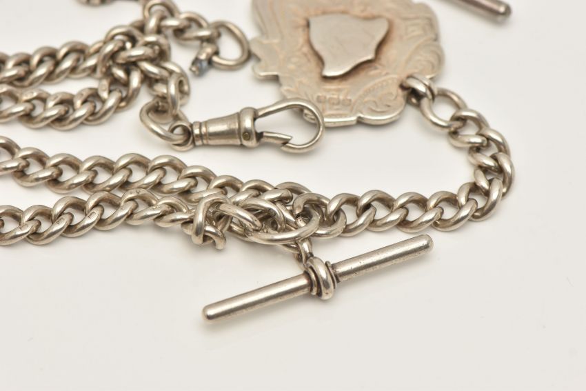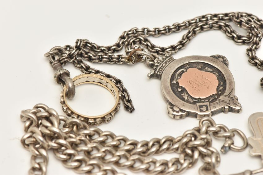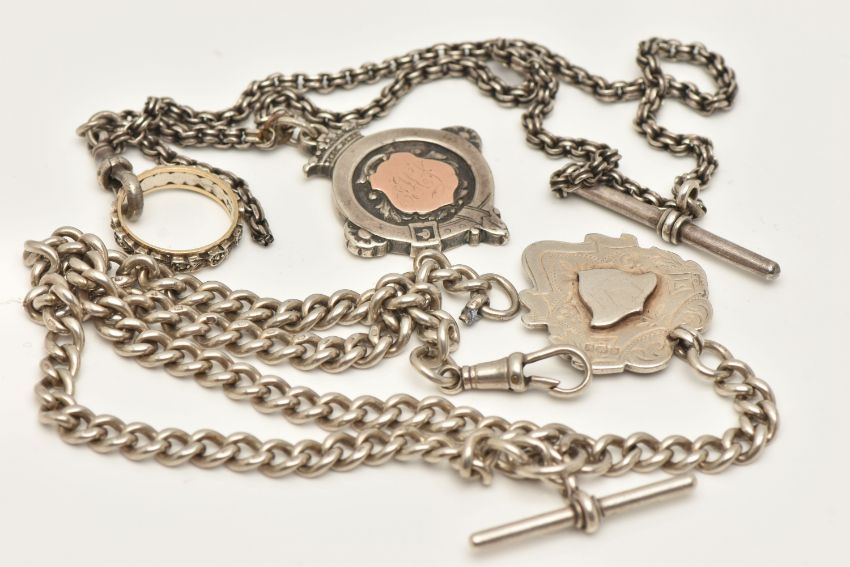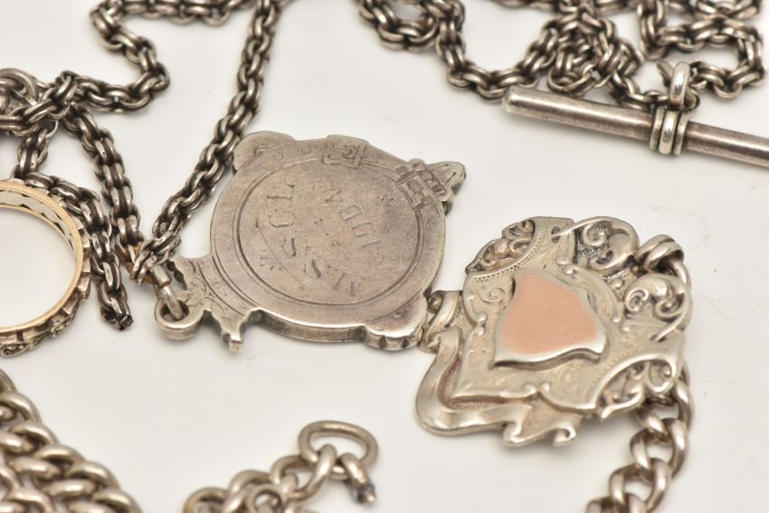 TWO ALBERT CHAINS WITH FOB MEDALS AND A RING, the first a double Albert chain with T-bar and lobster clasp (one clasp is missing), fitted with a fob medal, links stamped with sterling marks, rubbed makers marks, suspending a fob medal with vacant cartouche, hallmarked Birmingham, chain length 440mm, approximate gross weight 58.8 grams, together with a white metal chain with T-bar stamped sterling, lobster clasp unmarked with an engraved fob medal, hallmarked Birmingham, and a stamped 9ct and silver full set colourless spinel set band approximate gross weight 93.2 grams (condition report: general wear, second chain may require some attention, stone missing from the band)